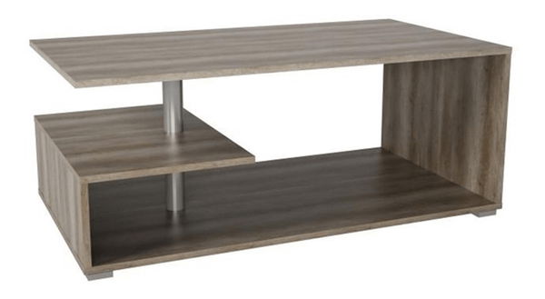 Konferenční stolek pěkného moderního designu, který bude zejména praktickým doplňkem ve Vašich interiérech. Má dvě odkládací poličky, při čemž jedna je menší a je spojena s vrchní a spodní deskou kovovou tyčí. Stolek je v barevném provedení dub canyon.