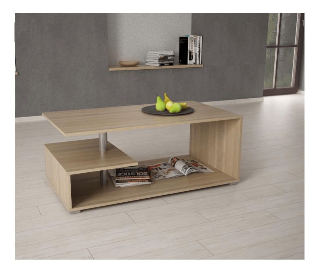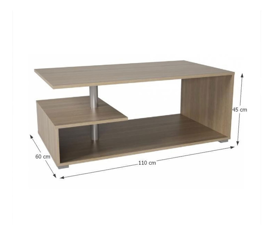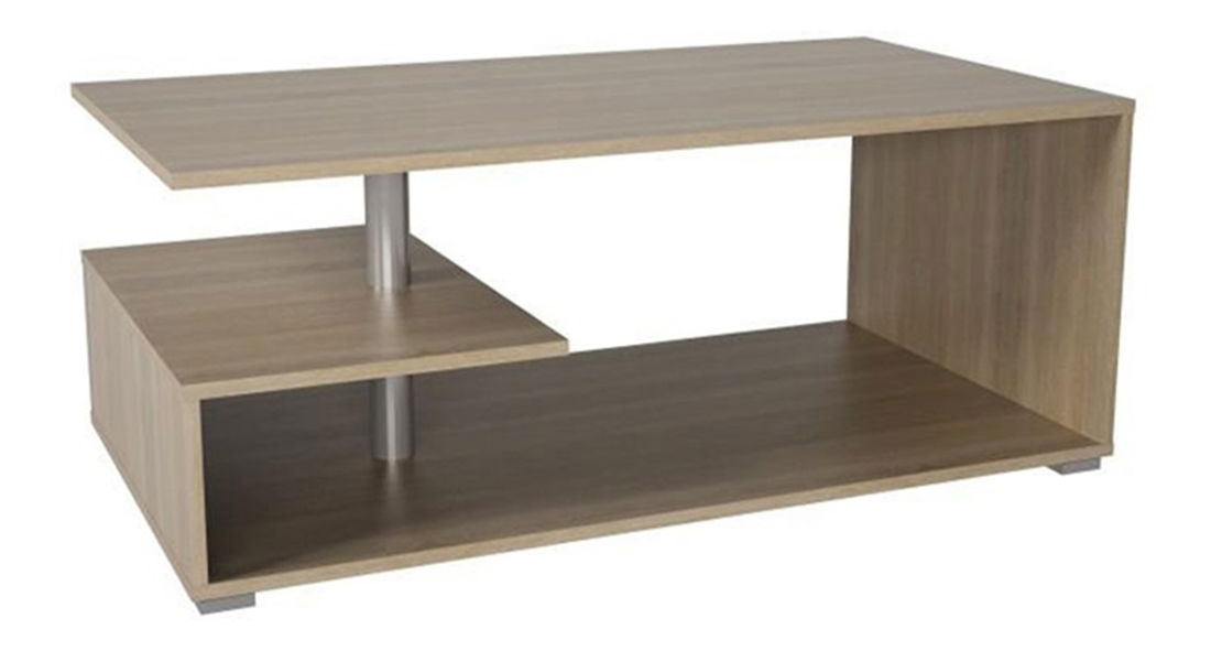 Konferenční stolek pěkného moderního designu, který bude zejména praktickým doplňkem ve Vašich interiérech. Má dvě odkládací poličky, při čemž jedna je menší a je spojena s vrchní a spodní deskou kovovou tyčí. Stolek je v barevném provedení dub sonoma.
