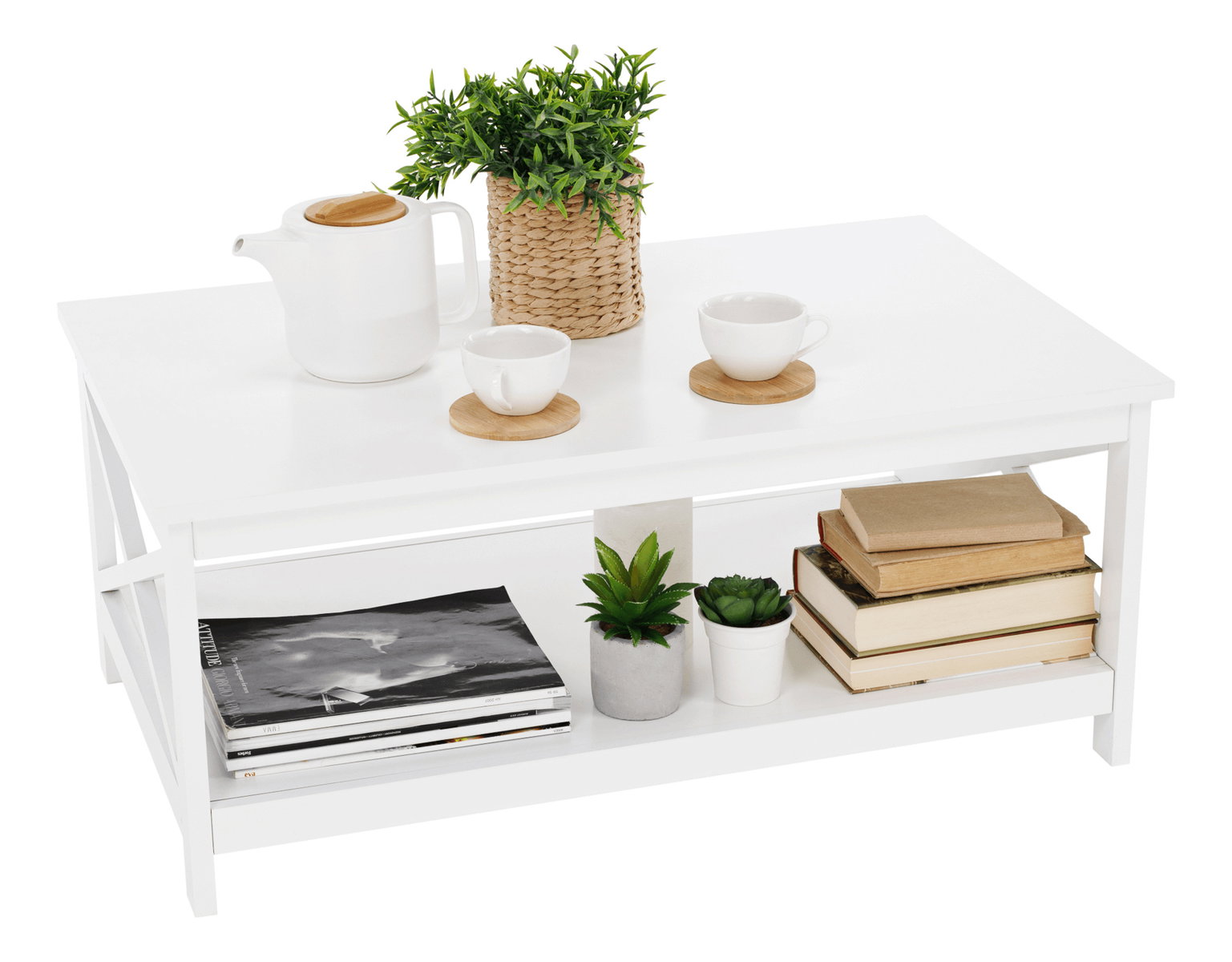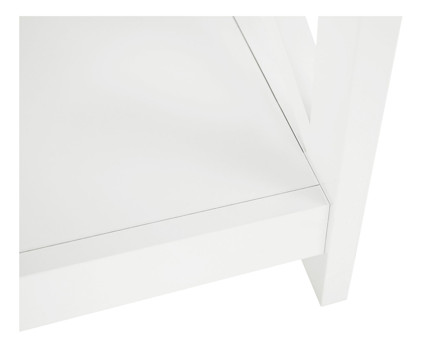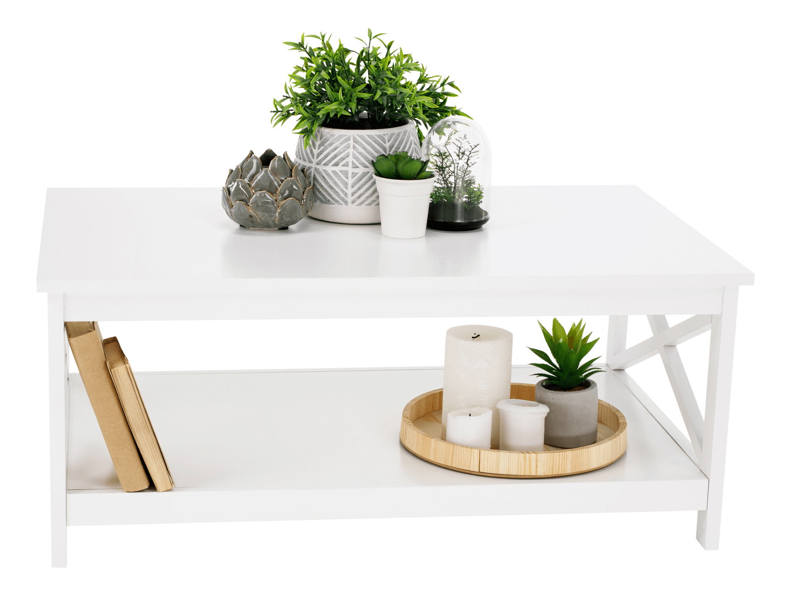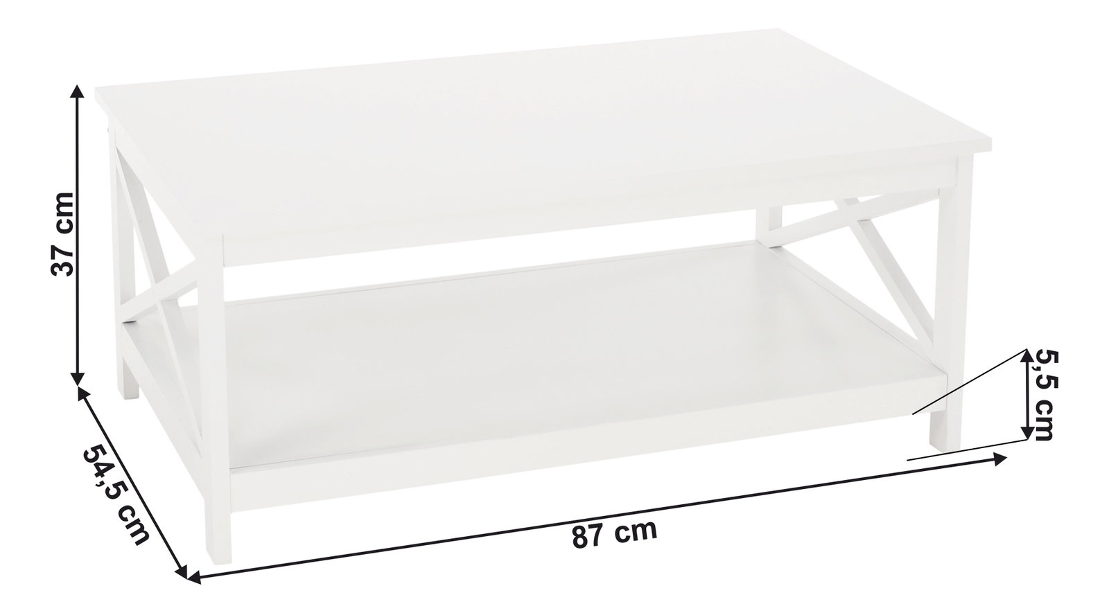 Konferenční stolek Etta (bílá) je skvělým doplňkem pro váš moderně zařízený obývací pokoj. Jeho design a stylové bílé provedení jistě upoutají vaši pozornost. Vyrobený z kvalitního materiálu MDF, tento stolek je nejen pěkný, ale také odolný. S výškou 37 cm, šířkou 87 cm a hloubkou 54,5 cm, nabízí dostatek prostoru pro odložení rozečtené knihy nebo časopisu na jeho praktické polici. Boční strany stolku připomínající písmeno x přidávají konferenčnímu stolku Etta estetický zážitek. Buďte inovativní a přidejte do vašeho obývacího pokoje tento stylový konferenční stolek Etta.