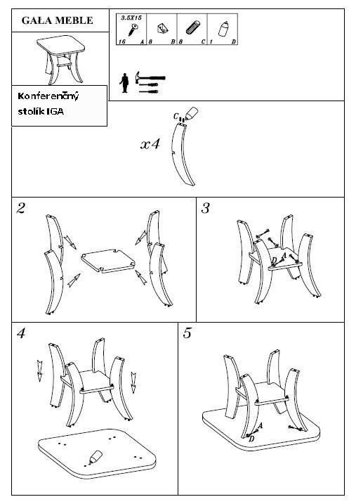 Designový konferenční stolek s čtvercovou horní deskou s oválnými hranami a čtyřmi oblými nožkami ohnutými směrem dovnitř vhodný do obývacího pokoje, jídelny nebo ložnice. Pod horní deskou je polička.