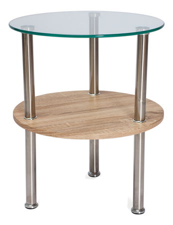 Malý konferenční stolek s kovovými nohami. Vrchní deska je z čirého skla a dolní odkládací polička je v barvě dřeva dub sonoma.