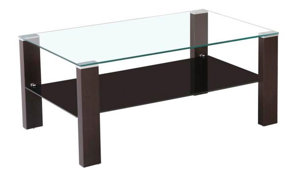 Konferenční stolek s nožkami v odstínu wenge se skleněnou horní deskou a střední poličkou z černého skla.