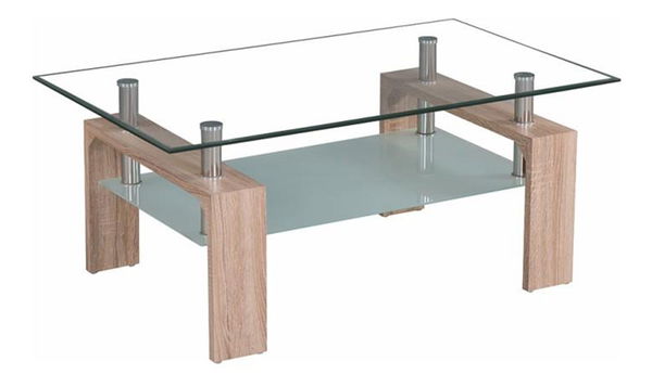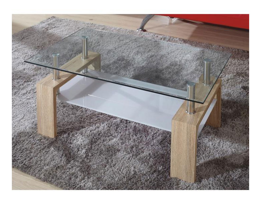 Stylový a praktický konferenční stolek stojící na nohách v provedení dub sonoma. Tvrzené sklo tloušťky 8 mm je upevněno na pochromovaných nožkách, spodní polička na odkládání je z bílého skla.