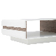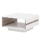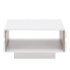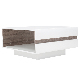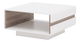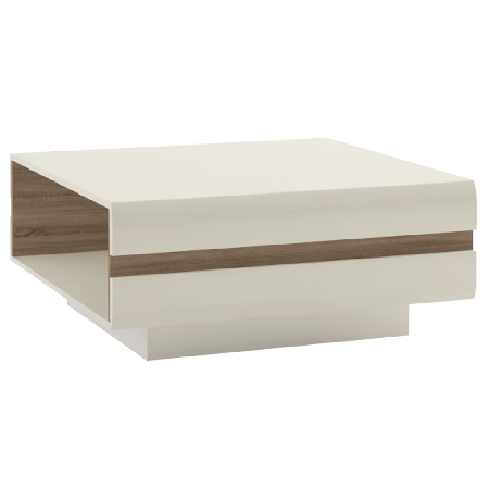 Designový konferenční stolek v lesklém odstínu bílé v kombinaci s výrazným designovým prvkem - pásem v odstínu dřeva dub sonoma truflový, který je na bocích stolku. Vnitřní odstín stěn je v odstínu dřeva dub sonoma truflový. Horní deska stolku není lesklá.