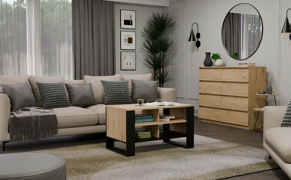 ZobrazitKonferenční stolek Maduro Slim 2 je dokonalým spojením moderního designu a praktičnosti, který obohatí váš obývací prostor. Jeho elegantní kombinace barev dub artisan a černá dodává nábytku nadčasový vzhled, zatímco frezované, drážkované boky imitující lamele mu dodávají jedinečný charakter. Stolek nabízí čtyři prostorné poličky pod deskou, které zajišťují dostatek úložného prostoru. Vyrobeno z kvalitní laminované dřevotřísky, je odolný vůči poškrábání, což zaručuje dlouhou životnost. Tento stylový a funkční kousek je ideální volbou pro každého, kdo hledá kombinaci elegance a prak.