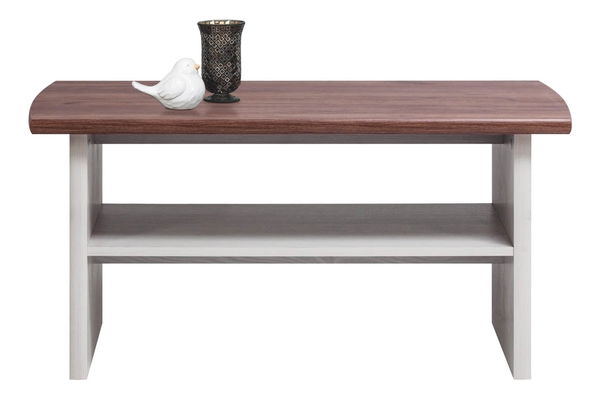 Vybavte si Váš obývací pokoj světlým konferenčním stolkem v provedení světlý modřín, který má horní desku v provedení dub a je vybaven poličkou umístěnou ve středu pod horní deskou. Stolek stojí na dvou nohách, které tvoří boční strany stolku.