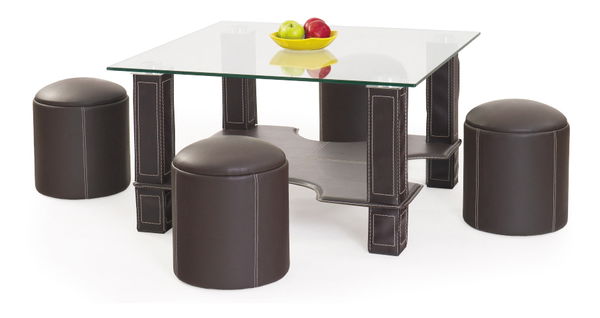 Moderní set do obývacího pokoje sestává z konferenčního stolku a čtyř taburetů. Nohy stolku a taburetky jsou čalouněné hnědou koženkou. Ve spodní poličce jsou půlkruhové výřezy, pro lepší skladování taburetů. Koženka má pěkné kontrastní prošívání.
