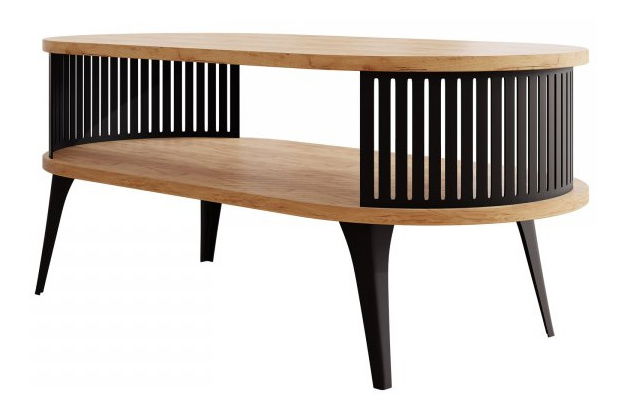 ZobrazitKonferenční stolek je ideální volbou pro ty, kteří hledají pohodlí a styl. Konferenční stolek Mozimo se postará o elegantní a funkční design ve vašem obývacím pokoji. Vyznačuje se zaobleným tvarem a dvouúrovňovou konstrukcí, která poskytuje prostor pro odkládání knih, časopisů nebo dekorací. Výrazným prvkem je prolamovaná černá struktura, která obklopuje prostor mezi deskami. Oválný konferenční stolek Mozimo má štíhlé kovové nohy, které mu dodávají moderní charakter a stabilitu. Stolová deska je dostupná v 6 zajímavých vzorech, což umožňuje sladit nábytek do různých interiérů a dekorativních stylů. Konferenční stolek je ideální jak do minimalistických obýváků, tak i do těch s eklektičtějším dekorem. Rozměry: šířka: 100 cm, výška: 44 cm, hloubka: 50 cm Provedení: laminovaná dřevotřísková deska tloušťky 18 mm, ABS hrana silná 2 mm, střední část, spojující horní a dolní desku, je vyrobena z oceli s práškovým nástřikem, nohy vyrobeno 24 měsíců