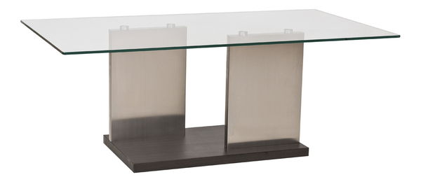 Designově pěkně navržený konferenční stolek Mira s dvojitým podstavcem v kovovém provedení. Spodní část je v tmavé barvě a vrchní část stolu je z průhledného skla.