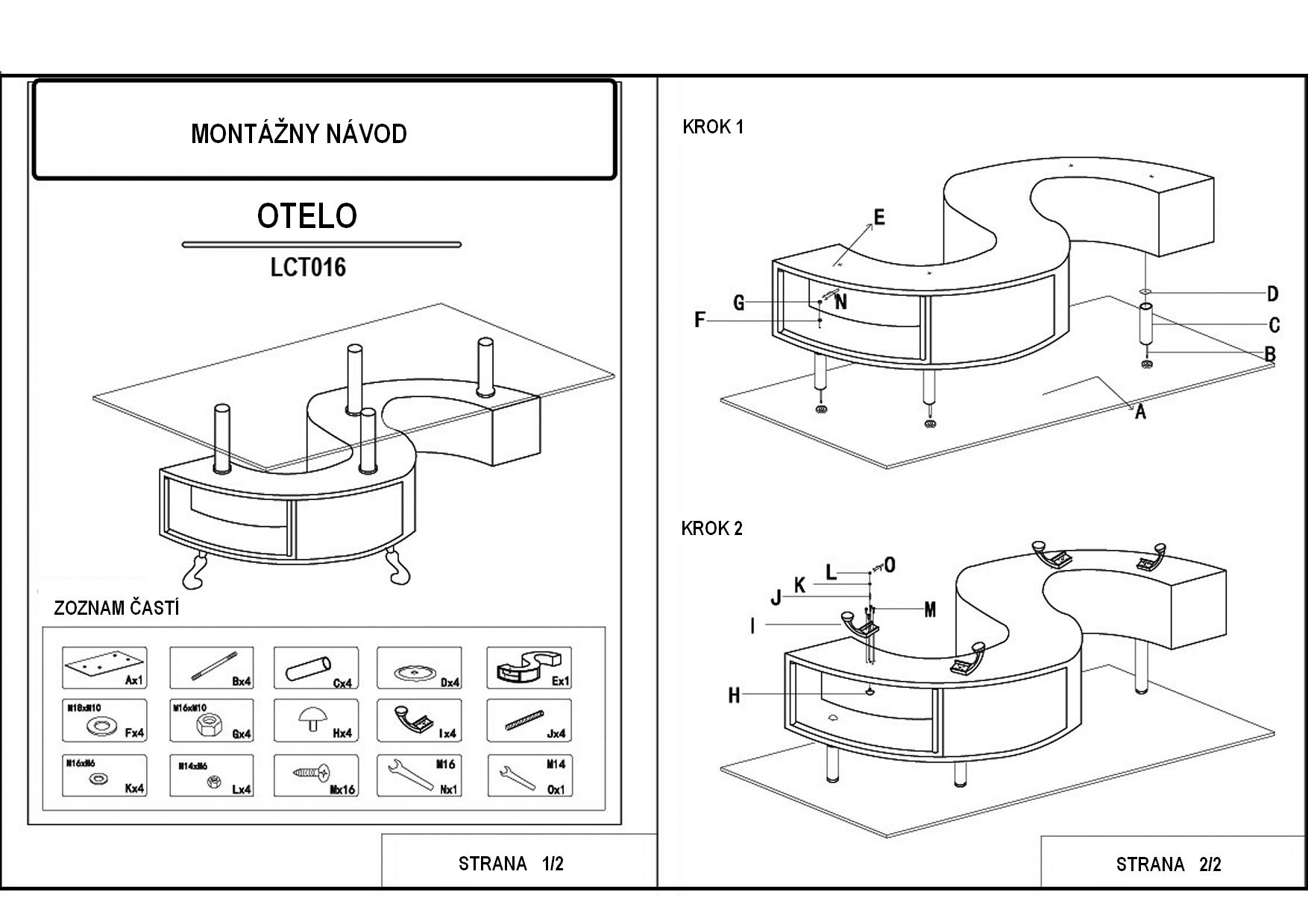 Konferenční stolek Otelo je vyroben z kvalitní MDF v barvě dřeva ořech. Je dodáván spolu se dvěma taburetkami, které mají vrchní část polstrovanou z ekokůže bílé barvy. Dřevěná konstrukce je prakticky navržena do tvaru písmene "s". Pokud se taburetky nevyužívají, dají se zasunout právě do výřezů v podstavci. Horní deska je z čirého tvrzeného skla.