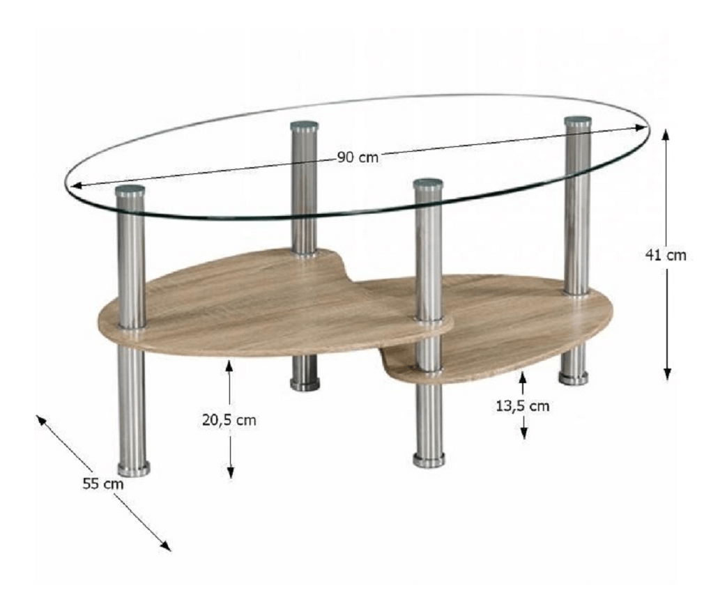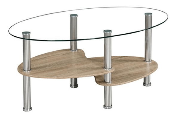 Konferenční stolek Panty s čirou skleněnou horní deskou, která je podpírána čtyřmi ocelovými nožičkami. Dolní odkládací polička je rozdělena na dvě části a je vyrobena z MDF v barvě dřeva Dub Sonoma.