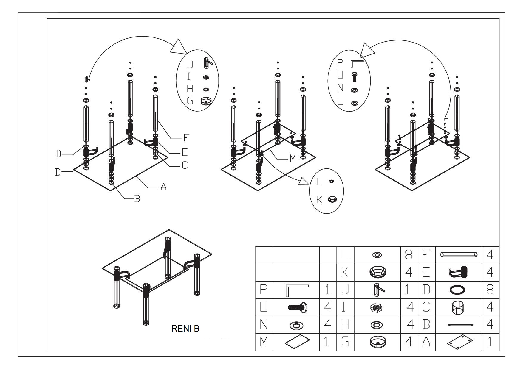 Konferenční stolek Reni B vychází designově i funkčně ze stolu Reni A. Zajímavě jsou řešeny nohy stolu, které mají vroubkovaný vzor. Stolek je vysoký 44 cm. Vrchní část stolu je z průhledného tvrzeného skla, pod kterou se nachází odkládací plocha z bílého mléčného tvrzeného skla.