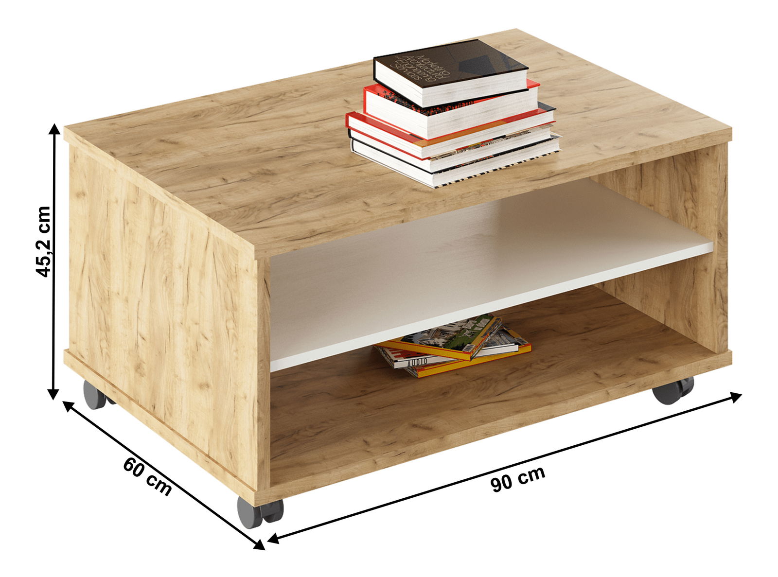Konferenční stolek Rumia 32 (dub artisan + bílá) s rozměry výšky 45,2 cm, šířky 90 cm a hloubky 60 cm je ideálním řešením pro váš jednací prostor. Jeho praktičnost zvýrazňuje 4 kolečka, která mu umožňují snadné přesouvání tam, kde bude zapotřebí. Konferenční stolek Rumia 32 je vyroben z kvalitní DTD laminované v barevném provedení dub artisan a bílá. S jeho pomocí bude váš jednací prostor nejen funkční, ale také stylový.