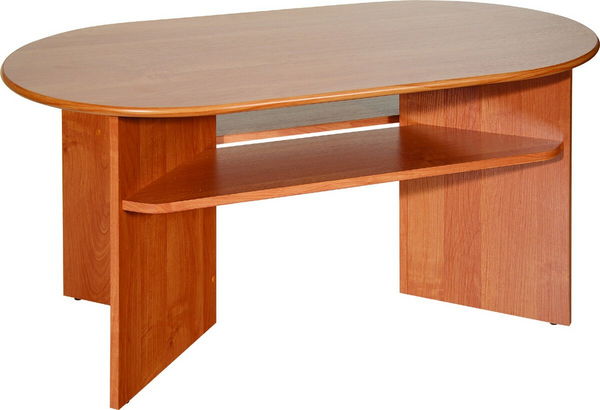 Elegantní konferenční stolek oválného tvaru horní desky se širokými nožičkami. Mezi dvěma nohama je upevněna polička na odkládání, stolek má poličky dvě.
