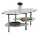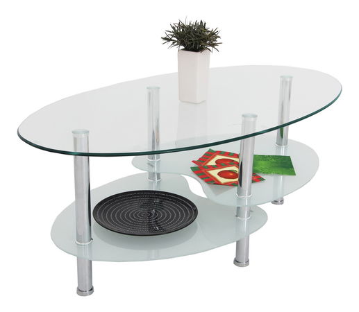 Konferenční stolek Sany má zajímavě navrženou dolní poličku, která je designově rozdělena na dvě úrovně. Vyrobena je z tvrzeného mléčného skla, na rozdíl od horní desky, která je ze skla čirého. Čtyři podpůrné nožičky jsou v barvě chromu.