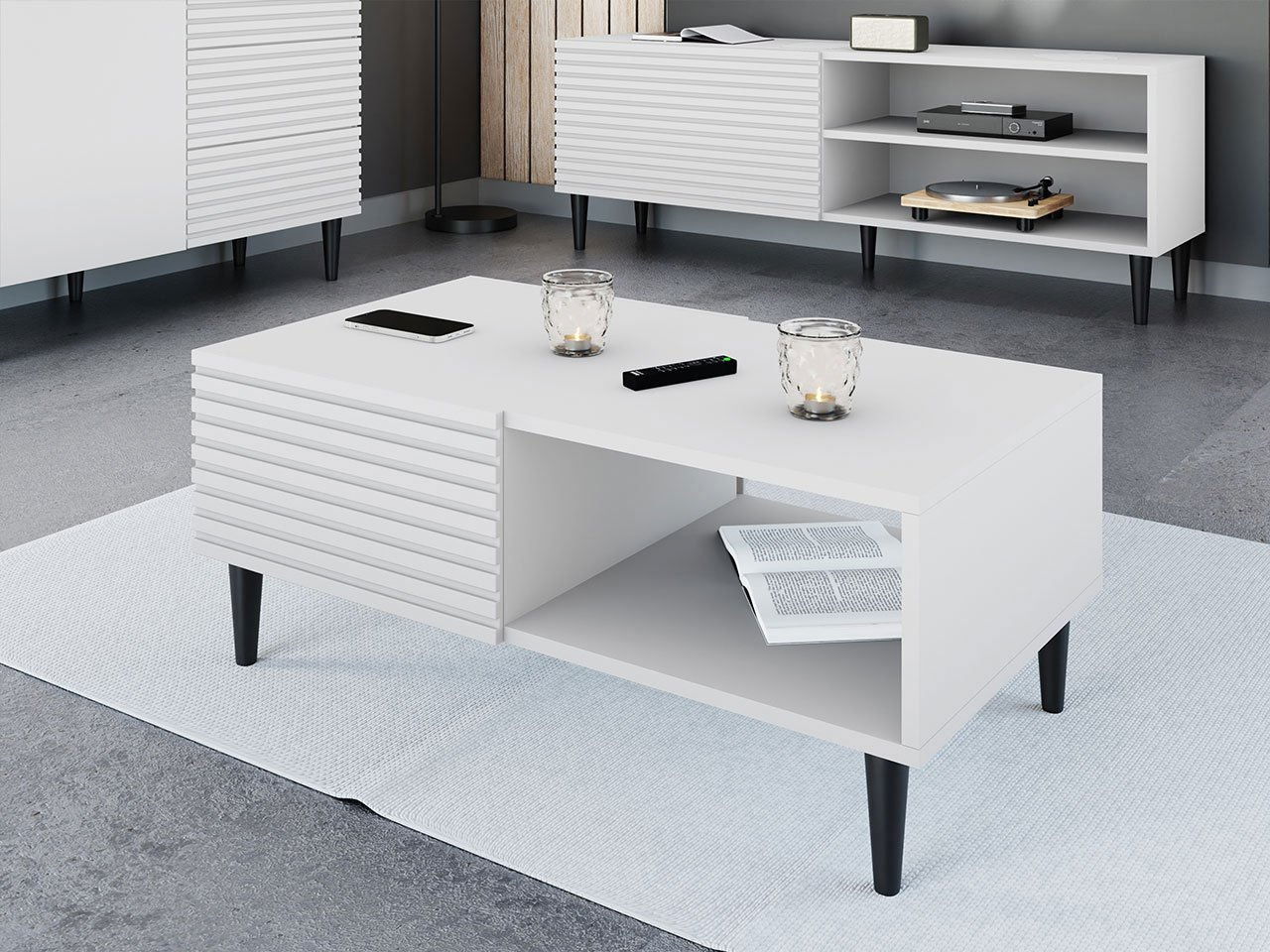 Jedním z nezbytných prvků každého obývacího pokoje je konferenční stolek Sarlana1K. Tento mimořádně praktický model se stane dokonalým společníkem na sedačku, rohovou sedačku nebo křeslo. Na jeho desku si můžete položit šálek kávy nebo knihu, kterou právě čtete. Je také ideálním základem pro talíř s občerstvením nebo drobnými dekoracemi. Model je osazen na dřevěných, kónických nožičkách, které výrazně usnadní čištění podlahy. Disponuje také úložným prostorem v podobě otevřené a uzavřené police. Konferenční stolek nemá žádná madla a lze jej otevírat díky systému „push to open“.