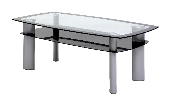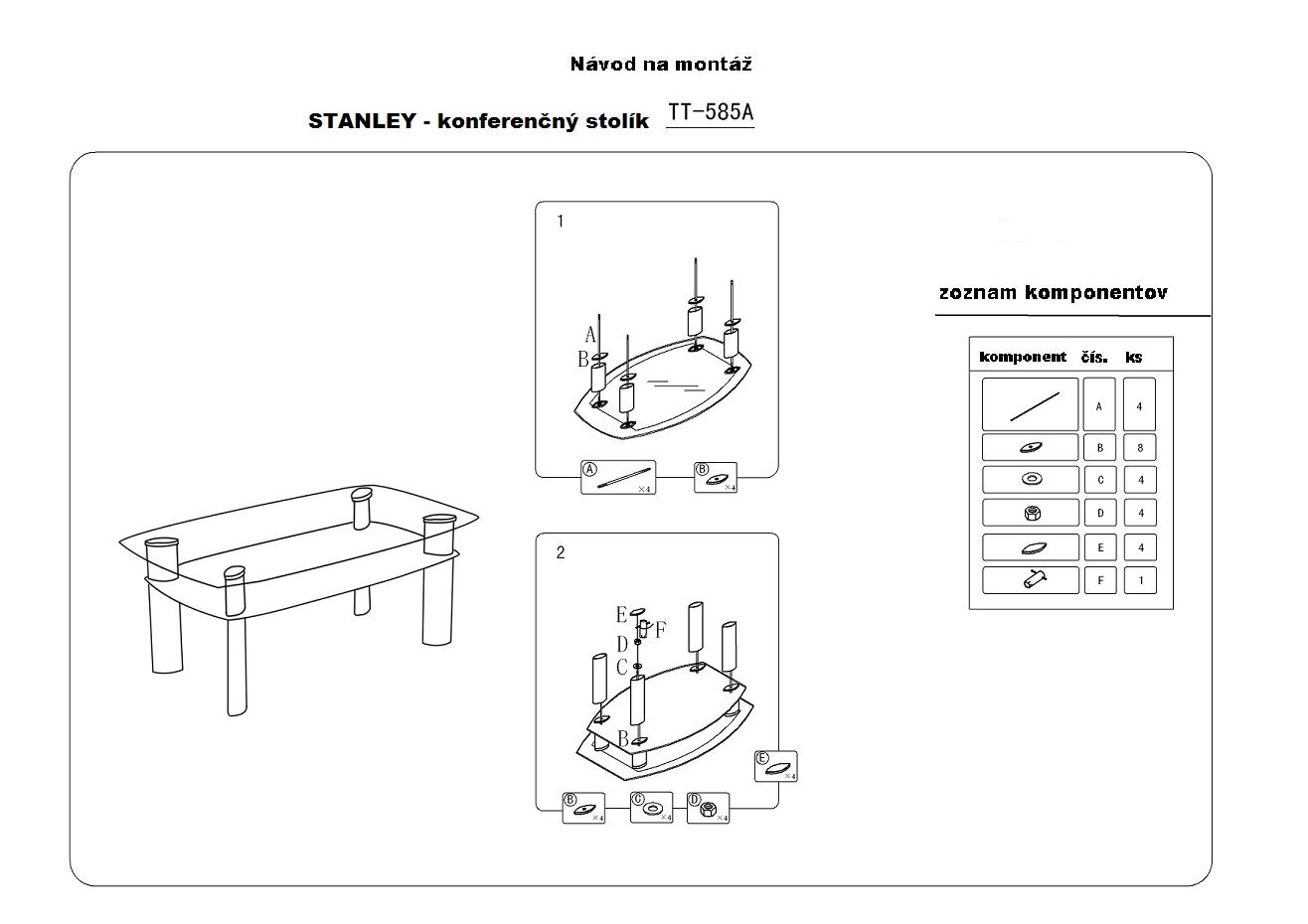 Luxusní konferenční stolek Stanley TT-585A má masivní kovové nohy stříbrné barvy, které drží dvě úrovně odkládacích ploch. Horní je z čirého tvrzeného skla (8mm) a na okraji se nachází černý pás. Dolní polička je také skleněná (5mm), ale obarvená na černo. Doporučuje se kombinovat s jídelním stolem Stanley TD-585 a TV stolkem Stanley TV-900.