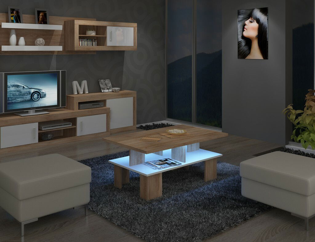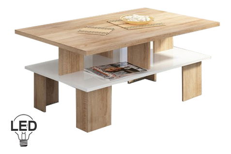 ZobrazitDesignově propracovaný konferenční stolek bude moderním kusem nábytku ve Vaší místnosti. Ale jen v designu nespočívá jeho jedinečnost. Tu ještě ukáže po setmění. Volitelné LED osvětlení vypadá super a dodá nábytku a místnosti úžasný efekt. Je to novinka na trhu s nábytkem. Konferenční stolek má i praktickou poličku, která slouží k odkládání novin, ovladače od TV, prostě věcí, které chcete mít vždy po ruce. Umístit jej můžete do obývacího pokoje, pracovny, kanceláře nebo ve vstupní hale. Tloušťka horní desky stolku je 25 mm. Barevné provedení je sonoma světlá v kombinaci s bílým vysokým leskem.