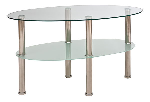 Oválný konferenční stolek Leo A je patrovo řešen, kde spodní patro slouží jako odkládací prostor. Vrchní úroveň je z krásného průhledného tvrzeného skla a spodní z mléčného skla. Nohy stolku jsou v barevném provedení chromu.