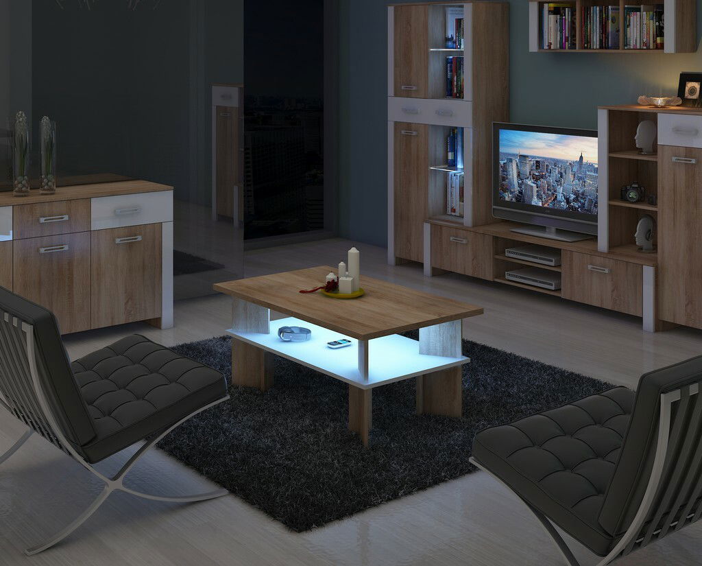 ZobrazitKonferenční stolek je praktickou součástí obývacího pokoje, pracovny či kanceláře. Na trhu s nábytkem je jich nespočet druhů. Ale konferenční stolky s LED osvětlením, ty jsou novinkou na trhu. Po setmění se naplno projeví. Volitelné LED osvětlení vypadá super a dodá nábytku a místnosti úžasný efekt. Konferenční stolek má i praktickou poličku, která slouží k odkládání novin, ovladače od TV, prostě věcí, které chcete mít vždy po ruce. Umístit jej můžete do obývacího pokoje, pracovny, kanceláře nebo ve vstupní hale. Barevné provedení je sonoma světlá v kombinaci s bílým vysokým leskem.