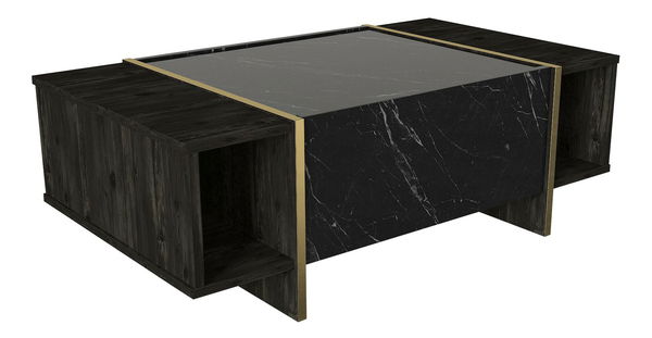 Konferenční stolek Veya je moderní a elegantní stolek, který se bude skvěle hodit do jakéhokoli interiéru. S výškou 37.3 cm a velikostí 103.8 cm x 60 cm nabízí dostatek místa na odkládání různých předmětů a pohodlné místo pro kávu nebo čaj s přáteli. Stolek je vyroben z kvalitní 100% melaminové desky, která zaručuje dlouhou životnost a odolnost vůči poškození. Černá barva kombinovaná s elegantními zlatými detaily dodává stolku luxusní a nadčasový vzhled. Konferenční stolek Veya je skvělou volbou pro ty, kteří hledají spojení funkčnosti a designu.