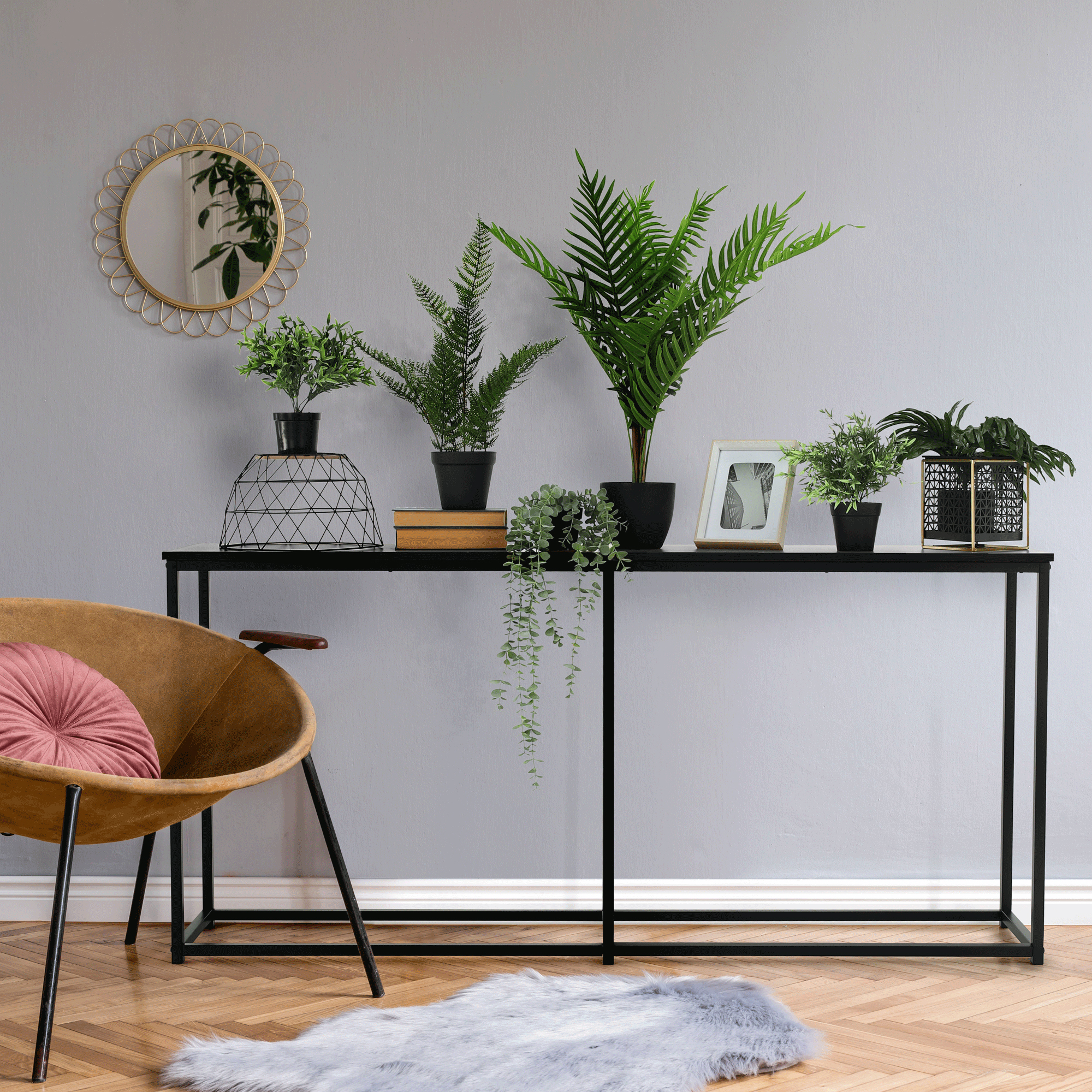 Konzolový stolek Burnet v tmavě šedé grafitové a černé barvě o výšce 75 cm a hloubce 30 cm je designový kousek ve skandinávském stylu, který se hodí do obývacího pokoje, ložnice nebo předsíně. Konstrukce stolku je vyrobena z kovu, o tloušťce 2x2 cm a nosností až 20 kg. Vrch stolku je vyroben z DTD foliovaného materiálu, který výrobku dodává luxusní vzhled. Stolek je dodáván v demontu, ale jeho jednoduchá montáž vám nezabere moc času.