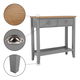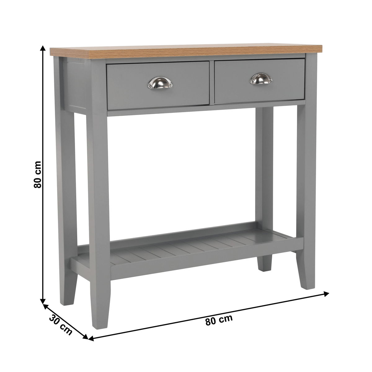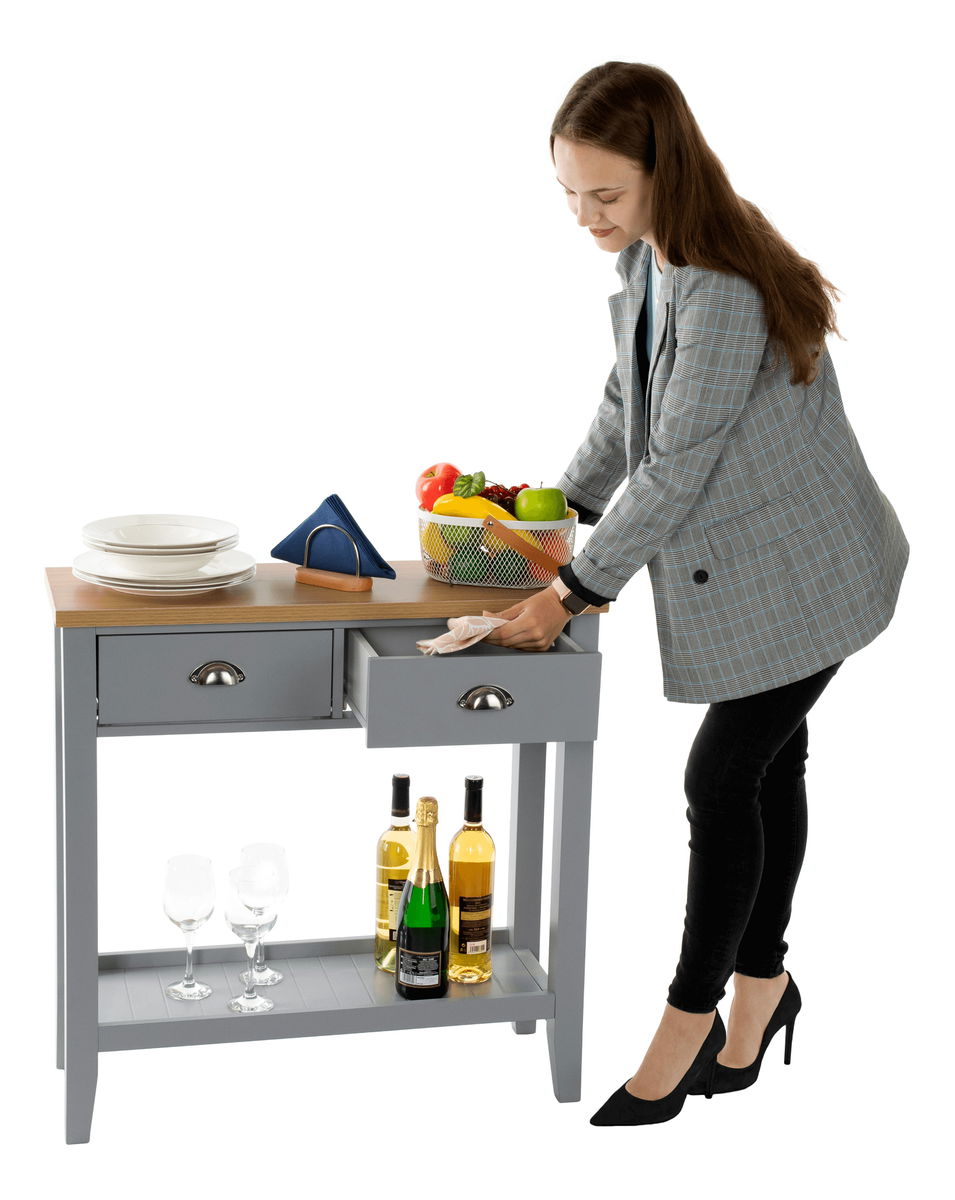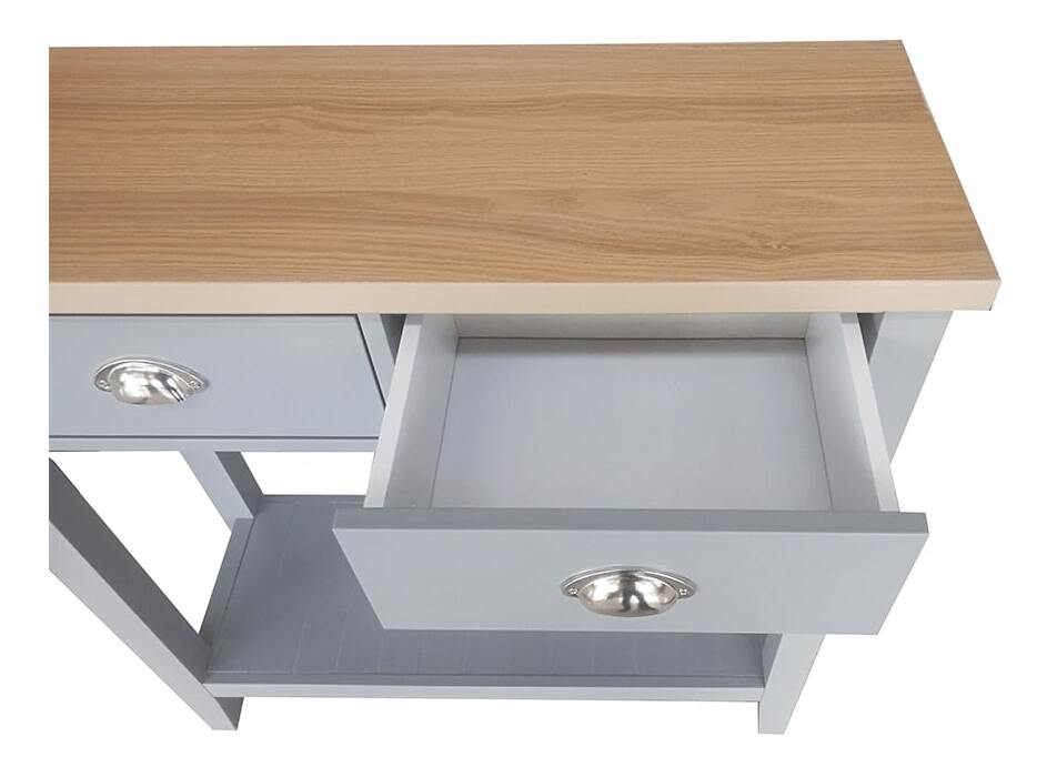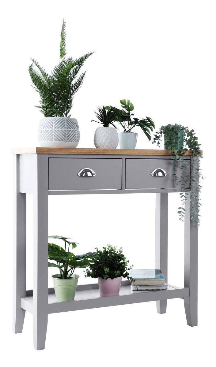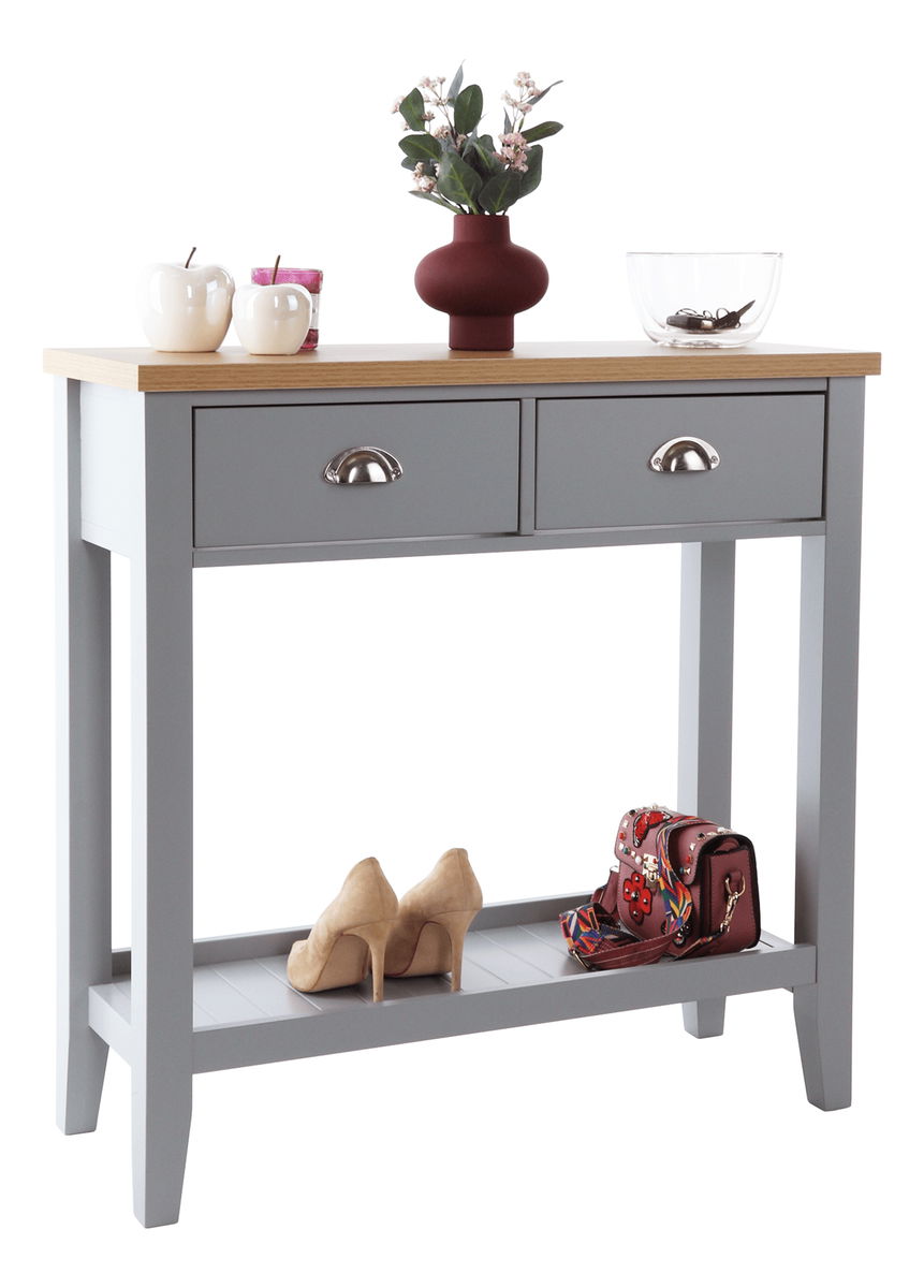 Konzolový stolek Freude (šedá + světlý ořech) o výšce 80 cm a hloubce 30 cm je ideální volbou pro ty, kteří hledají impozantní kombinaci rustikálního a skandinávského minimalistického stylu do svého obývacího pokoje, ložnice nebo předsíně, tento stolek nabízí úložný prostor. který vám pomůže udržet vaše věci v pořádku. je vybaven úchyty na zásuvky, čímž se zajistí snadné otevírání a zavírání. Materiál vrchní desky je vyroben z DTD laminované, zatímco korpus je vyroben z MDF materiálu.