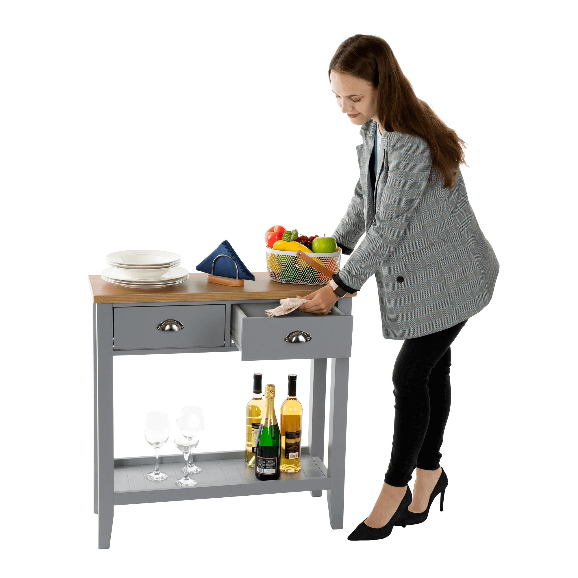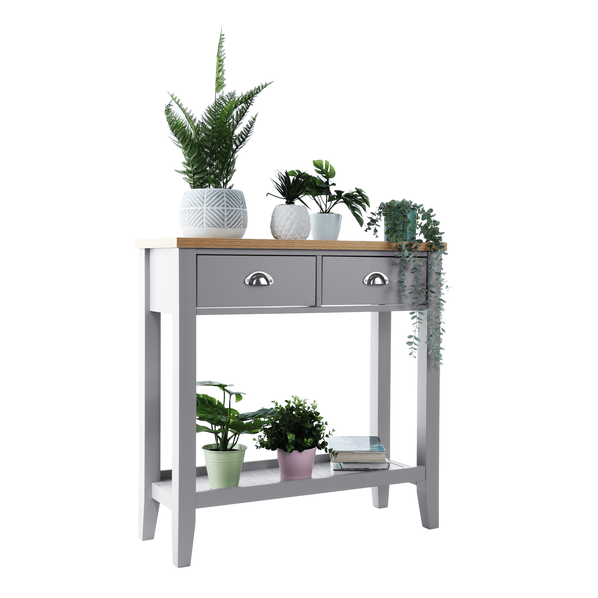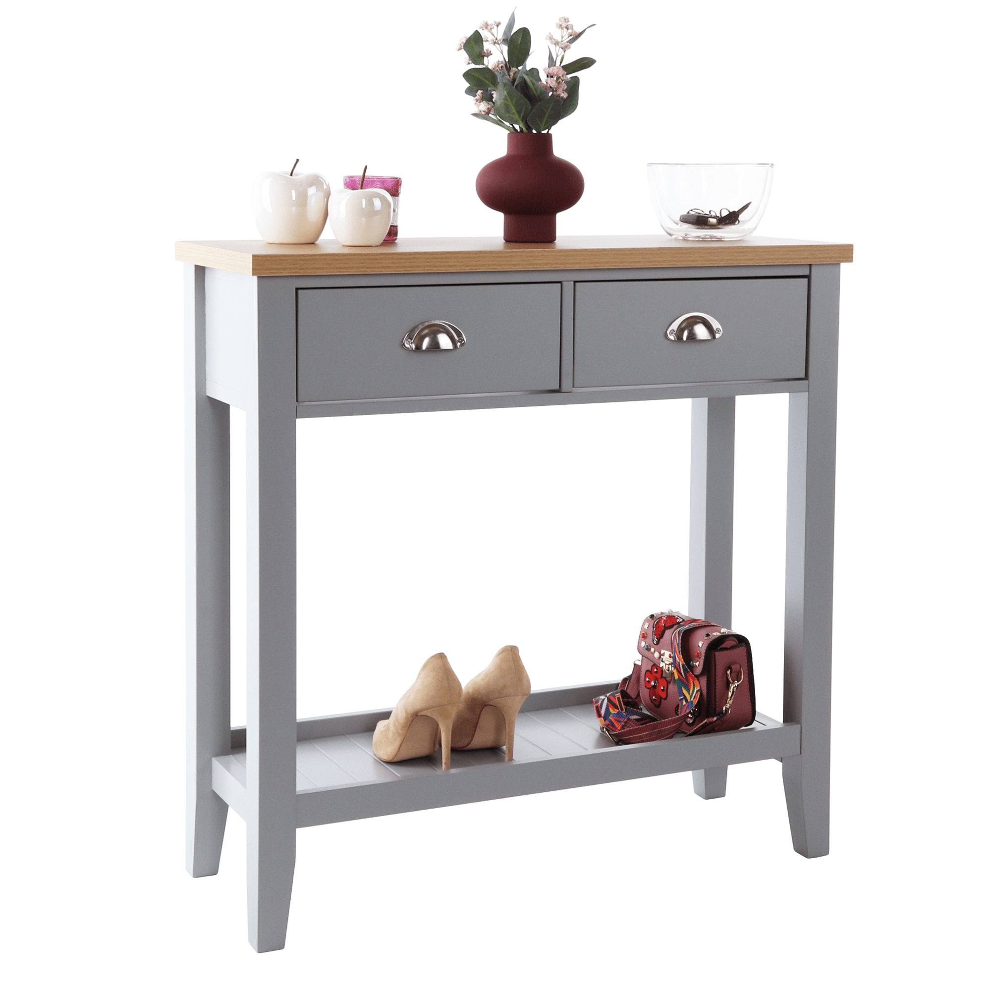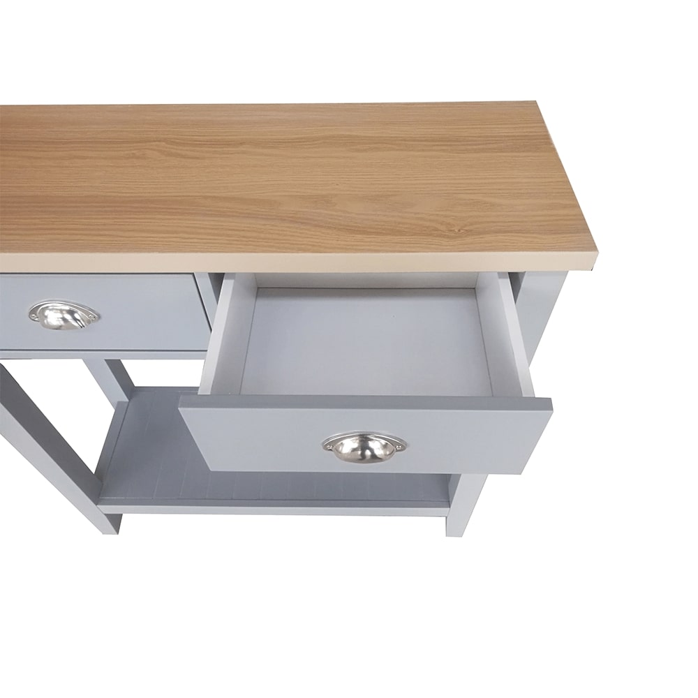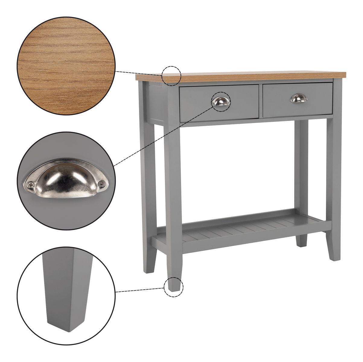 Konzolový stolek Freude (šedá + světlý ořech) o výšce 80 cm a hloubce 30 cm je ideální volbou pro ty, kteří hledají impozantní kombinaci rustikálního a skandinávského minimalistického stylu do svého obývacího pokoje, ložnice nebo předsíně, tento stolek nabízí úložný prostor. který vám pomůže udržet vaše věci v pořádku. je vybaven úchyty na zásuvky, čímž se zajistí snadné otevírání a zavírání. Materiál vrchní desky je vyroben z DTD laminované, zatímco korpus je vyroben z MDF materiálu.