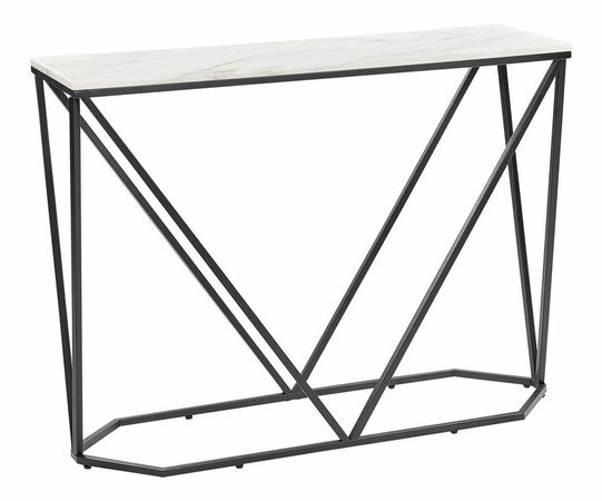 Zkrášlete vzhled svého obývacího pokoje pomocí tohoto elegantního konzolového stolku. Obdélníková stolová deska z vysoce kvalitního MDF materiálu zaujme povrchovou úpravou s bílým mramorovým efektem, který dodá jakémukoli interiéru špetku elegance a sofistikovanosti. Stolek je doplněn elegantním kovovýma nohama s práškovým nástřikem, díky kterým vypadá stylově a vydrží dlouhá léta.
