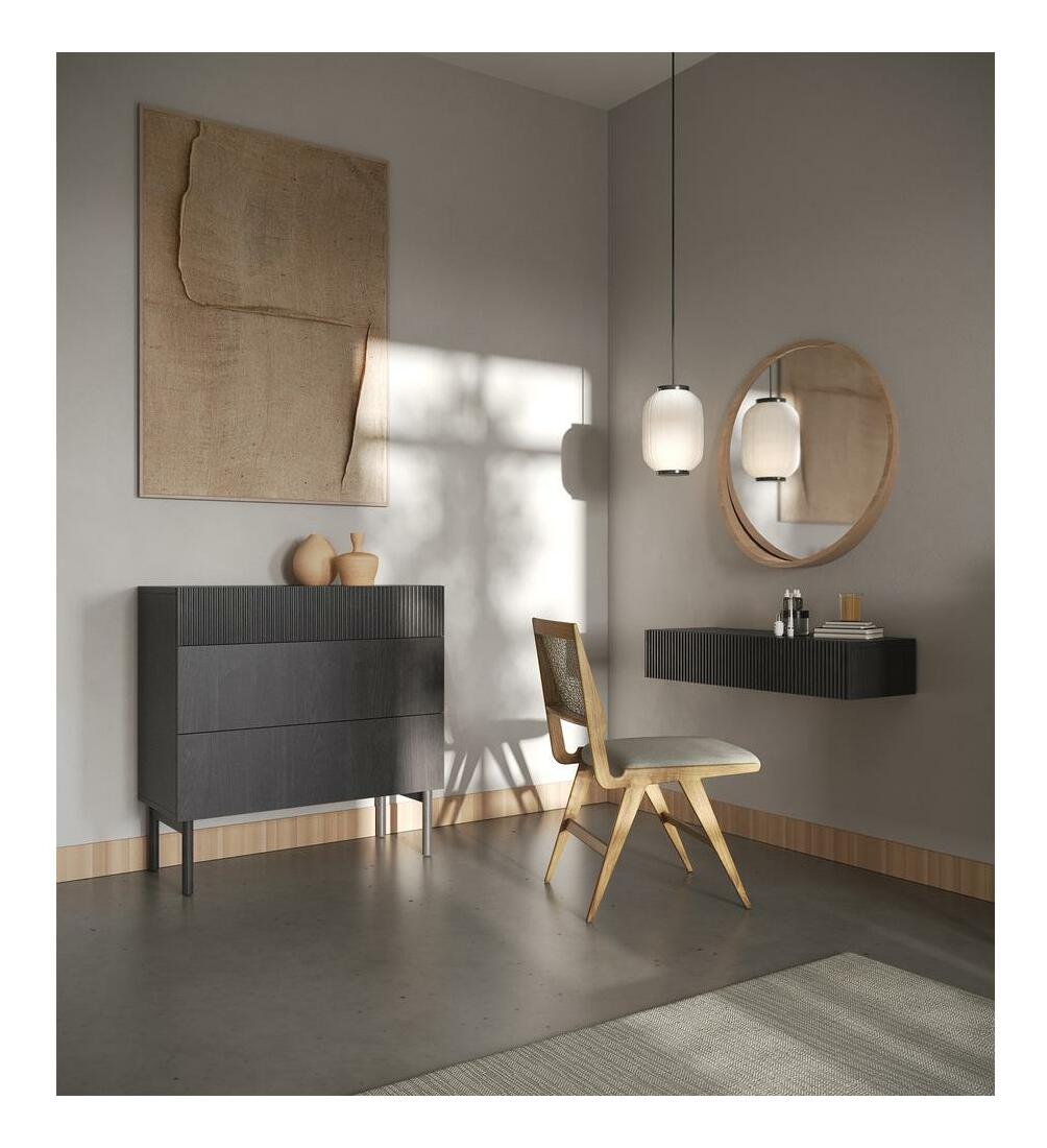 Sníte o interiéru, ve kterém se snoubí minimalismus japonského designu s teplem skandinávského dřeva? Objevte kolekci a vneste do svého bytu klid, eleganci a funkčnost Konzole je harmonickým spojením funkčnosti a estetiky v japonském stylu Nábytek je vyroben z odolné laminované desky a MDF desky s klasickými a přírodními barevnými čely, které dodává interiéru přirozenou a příjemnou estetiku. Zásuvka byla navržena s ohledem na funkčnost a vybavena systémem push to open, který umožňuje snadné a bezproblémové otevírání. Toaletní stolek díky možnosti zavěšení získává lehkost a sofistikovanost při zachování funkčnosti a nezatěžuje prostor. Prostorná stolová deska bude ideálním místem pro položení elegantní kytice, fotografií vašich blízkých nebo pro rychlé odložení klíčů v předsíni. Japandi styl je kombinací jednoduchosti a útulnosti a kolekce dokonale odráží tuto rovnováhu Detaily produktu: korpus vyrobený z laminované desky v barvě R20348 Portland Ash Black, tloušťka 16 mm, odolný vůči vlhkosti, teplotě a poškrábání, provedená frézovaná čela. z MDF desky potažené fólií v barvě korpusu, push to open systém použitý na čelech usnadňuje plynulé otevírání a zavírání nábytku, konstrukce vyztužená 0,5 mm ABS hranami, zásuvka uložená na 27 mm kuličkových vodítkách, zajišťuje hladké a volné rozšíření.
