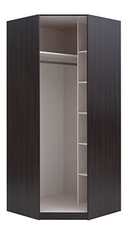 Korpus rohové šatní skříně Wektra SZFN1D. Šatní skříň má v levé části věšákovou tyč, kam si můžete pověsit vaše oblíbené oblečení a v pravé části se nacházejí praktické poličky pro vaše doplňky.