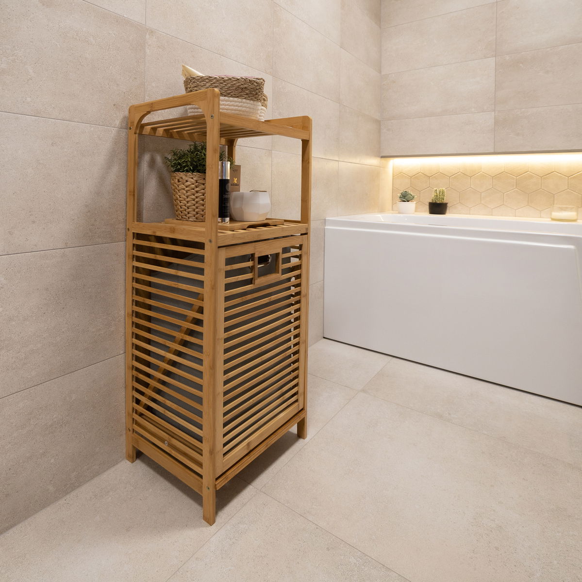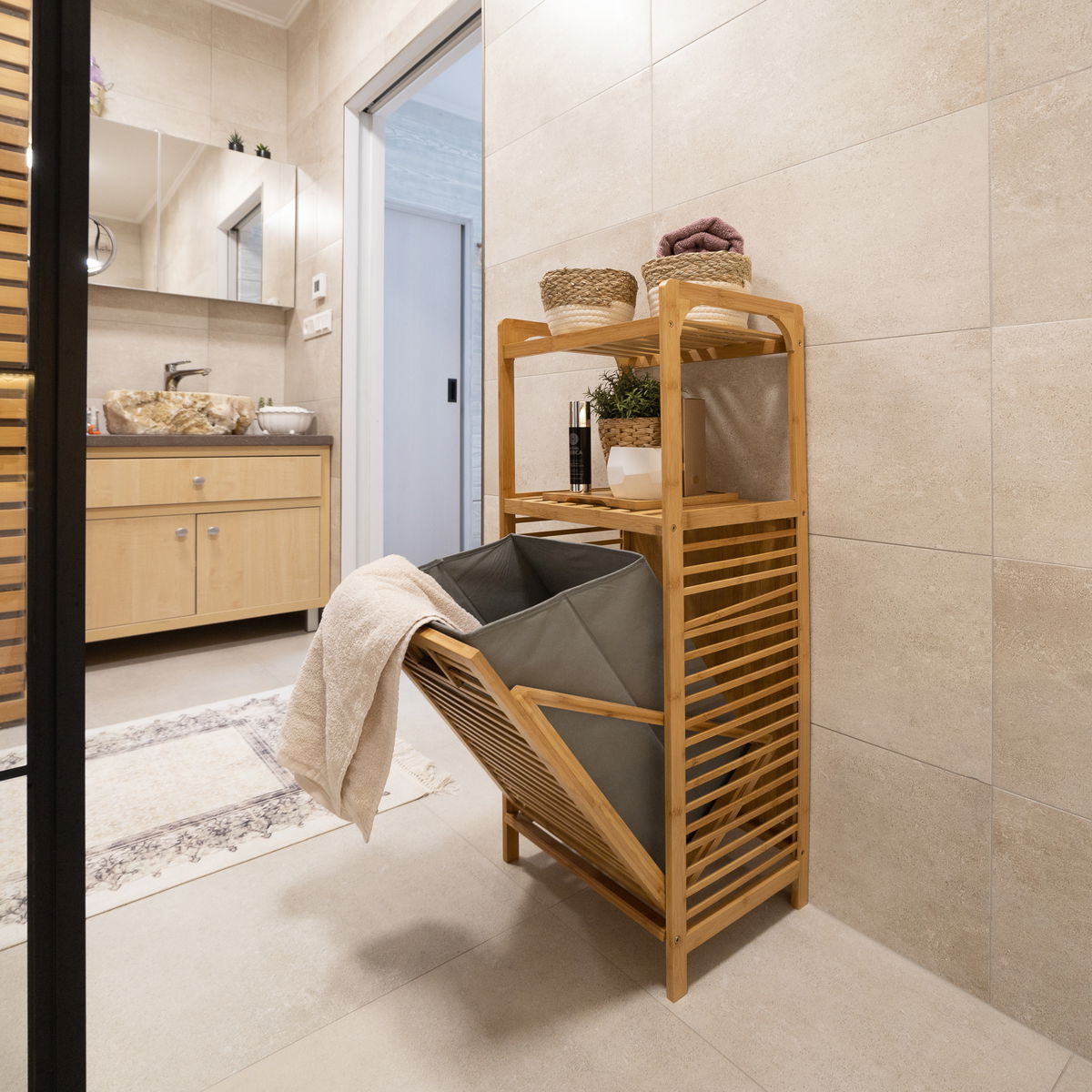 Nový koš na prádlo Sansal je skvělou volbou pro každou domácnost. Vyroben z přírodního bambusu a šedé látky, koš má výšku 95 cm, šířku 40 cm a hloubku 30 cm. sáček na prádlo a otevřený úložný prostor na odkládání ručníků, županů nebo kosmetiky. Koš na prádlo Sansal je skvělým řešením pro udržení vaší koupelny nebo prádelny udržovanou a stylovou.