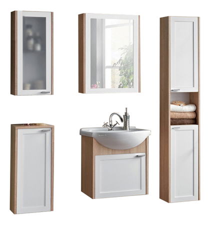 Moredná koupelnová sestava vyrobená z kvalitní LTD (16 mm). Korpusy a dvířka jsou v barvě dub sonoma s bílou. Sestava se skládá z pěti dílů. Je možné prohodit dvířka skříňky a vitríny.