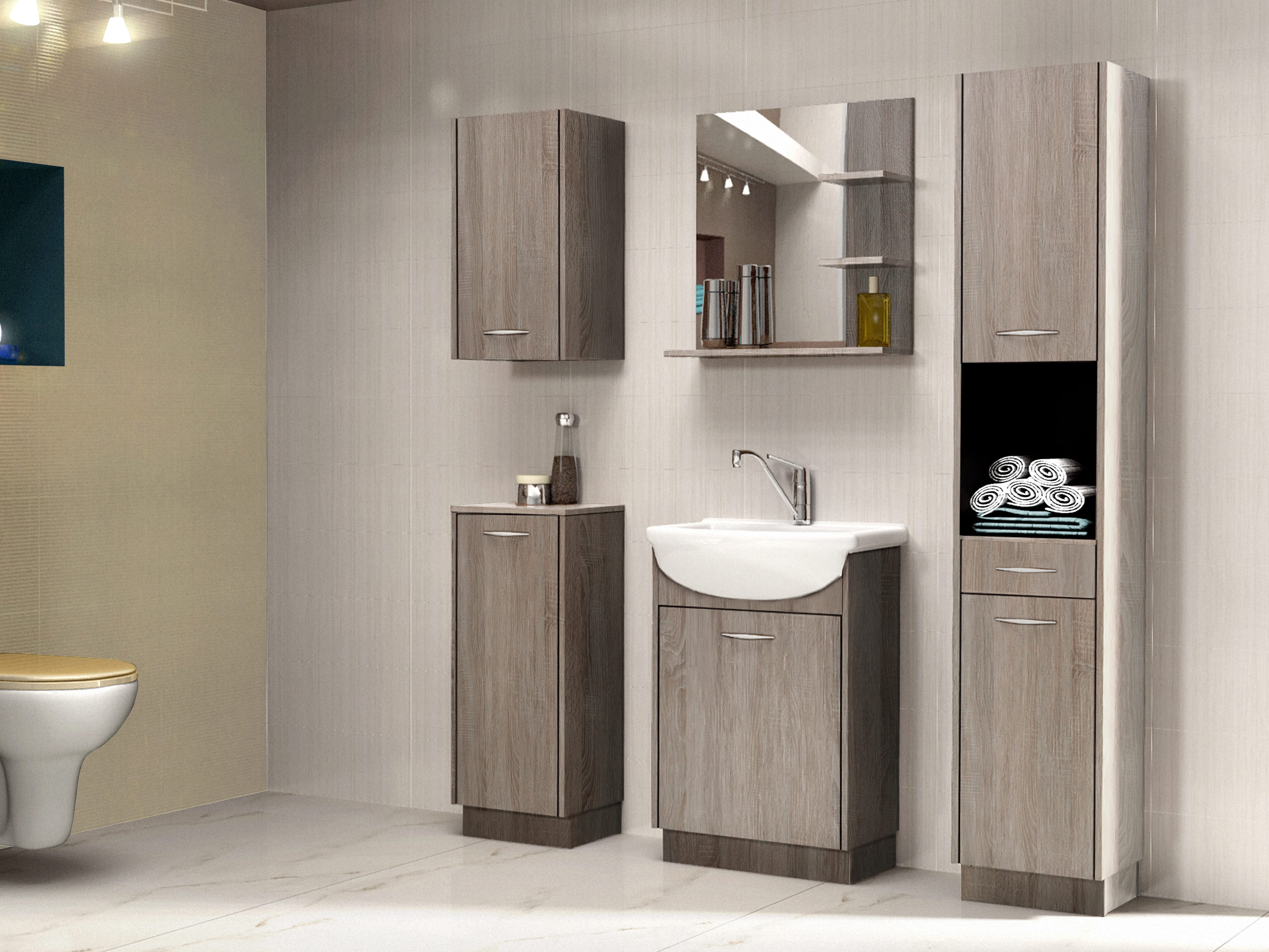 Koupelnová sestava s množstvím odkládacího prostoru. Už nebudete mít předměty jen tak volně se povalující kde tu. Pěkně si je zorganizujete a každý bude mít své místo. Vysoká skříňka je vybavena 2 dvířky, jednou otevřenou poličkou uprostřed, pod kterou je umístěna mělká zásuvka. Koupelnová skříňka pod umyvadlo má jedny dvířka a prostor na umístění umyvadla. Dvě skříňky vpravo mají každá jedny dvířka. Panel se zrcadlem má jednu podlouhlou poličku a dvě krátké.