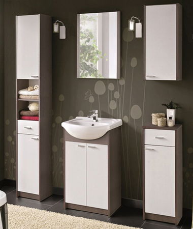 Moderní koupelnová sestava Soprano je vyrobena z kvalitního lamina. Korpusy jsou v barvě dub sherwood v kombinaci s bílou barvou na dvířkách. Je složena z pěti dílů. Kromě umyvadlové skříňky mají ostatní vždy po jedné poličce.