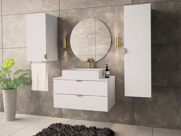 Koupelnová sestava Boterio I je ideální volbou pro ty, kteří hledají pohodlí a styl. Koupelnový nábytek Boterio I je nezbytným prvkem každé koupelny. Souprava se vyznačuje funkčností, odolností a estetikou. Tento nábytek působí minimalisticky, ale díky detailům jako jsou frézovaná čela a zlaté detaily získává elegantní charakter. Četné police umožňují udržovat koupelnu v dokonalém pořádku. Prostorné skříňky jsou ideálním místem pro různé druhy kosmetiky, ručníků a koupelnových doplňků. Originálnost dodává vzor ve tvaru embosovaných diamantů, umístěný na čelech skříněk. V kombinaci se zlatými úchyty vnáší do interiéru nevšední aranžérský akcent. Koupelnový nábytek je vyroben z pevných komponentů, které zajišťují dlouhou životnost. Rozměry: Skříňka pod umyvadlo Boterio 01: šířka: 80 cm, výška: 42 cm, hloubka: 46 cm, Nástěnná skříňka Boterio 02: šířka: 35 cm, výška: 120 cm, hloubka: 35 cm, Závěsná skříňka Boterio 03: šířka: 3 550x420x115: šířka: 55 cm, výška: 12 cm, hloubka: 42 cm Provedení: korpus: laminovaná deska tloušťky 16 mm, fronty: 18 mm silná MDF deska, hrany zakončené PVC dýhou, rukojeť: kovové v zlat. ení umyvadlo za příplatek, sifon za příplatek, zrcadlo není v ceně setu. Možnost nákupu z naší nabídky Záruka: 24 měsíců