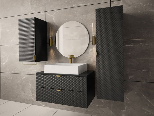 Koupelnový nábytek je nezbytným prvkem každé koupelny. Souprava se vyznačuje funkčností, odolností a estetikou. Tento nábytek působí minimalisticky, ale díky detailům jako jsou frézovaná čela a zlaté detaily získává elegantní charakter. Početné police umožňují udržovat koupelnu v dokonalém pořádku. Prostorné skříňky jsou ideálním místem pro různé druhy kosmetiky, ručníků a koupelnových doplňků. Originálnost dodává vzor ve tvaru embosovaných diamantů, umístěný na čelech skříněk. V kombinaci se zlatými úchyty vnáší do interiéru nevšední aranžérský akcent. Koupelnový nábytek je vyroben z pevných komponentů, které zajišťují dlouhou životnost. Rozměry: Skříňka pod umyvadlo: šířka: 80 cm, výška: 42 cm, hloubka: 46 cm, Nástěnná skříňka: šířka: 35 cm, výška: 120 cm, hloubka: 35 cm,Závěsná skříňka :šířka: 35 cm, výška: 78 cm, hloubka: 35 cm,Umyvadlo 550x420x115:šířka: 55 cm, výška: 12 cm, hloubka: 42 cm