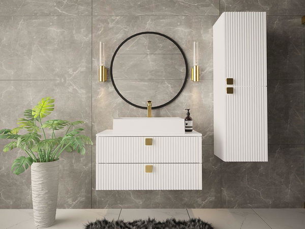 Receptem na krásný a praktický interiér je koupelnový nábytek. Dokonalý do každého prostoru. Sestává ze závěsných prvků, šetří místo na podlaze a dělají každodenní úklid hračkou. Do seznamu funkčních prvků můžeme přidat přehledné police a zásuvky, potřebné pro kosmetiku a různé doplňky. Kombinace rukojetí zlaté barvy s ozdobným frézováním na přední straně dodává úžasný vizuální efekt. Závěsná skříňka i ta pod umyvadlem mají spoustu úložného prostoru. K sestavě si můžete dokoupit také sifon a umyvadlo. Prezentovaný koupelnový nábytek změní vaše uspořádání a dodá mu exkluzivní charakter.