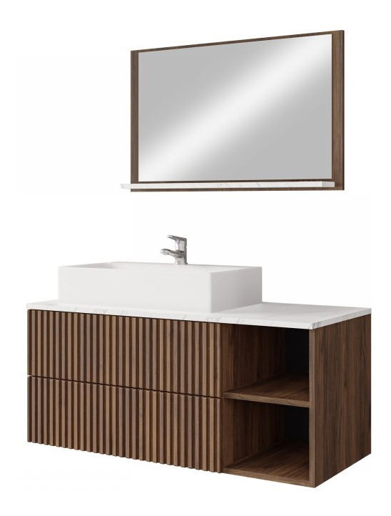 Koupelnová sestava je ideální volbou pro ty, kteří hledají pohodlí a styl. Koupelnový nábytek Kiegi Ryfel I je moderní a stylovou volbou. Elegantní drážky viditelné na přední straně umyvadlové skříňky v kombinaci s mramorovou deskou skvěle doplňují prostor koupelny. Žebrovaný koupelnový nábytek má promyšlený design. Závěsná skříňka nabízí dvě zásuvky a otevřené police. Takto řešený interiér poskytuje snadný přístup k uložené kosmetice a doplňkům. Součástí sestavy závěsného koupelnového nábytku je také zrcadlo s poličkou. Soudržný design obou prvků dokonale zapadá do moderního designu interiéru. Rozměry: Zrcadlo Kiegi Ryfel: šířka: 80 cm, výška: 50 cm, hloubka: 12 cm, Skříňka pod umyvadlo Kiegi Ryfel: šířka: 100 cm, výška: 45 cm, hloubka: 45 cm, Umyvadlo 550x420x5 cm, výška: 12 cm, hloubka: 42 cm Provedení: korpus: laminovaná dřevotříska tloušťky 16 mm, fronty: drážkovaná MDF deska, tloušťka 18 mm, ABS hrana silná 0,5 mm, záda vyrobená z HDF desky, spodní montážní vodítka umyvadlo za příplatek, sifon za příplatek, umyvadlové baterie viditelné na fotografii nejsou zahrnuty v ceně, prvky mramorové barvy jsou vyrobeny z laminované dřevotřískové desky o tloušťce 16 mm Záruka: 24 měsíců