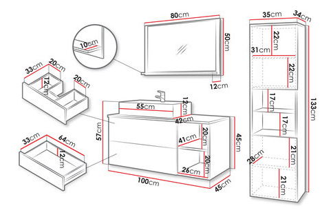 ZobrazitKoupelnová sestava je ideální volbou pro ty, kteří hledají pohodlí a styl. Nábytková sestava Kiegi Ryfel II dodá vaší koupelně moderní ráz. Vkusně zvolené barvy dokonale ladí se vzorovanými i hladkými obklady. Drážkované dekory zase dodávají interiéru koupelny poněkud dynamiky. Symetrické frézy jsou módní dekorací nábytku. Jejich minimalistický design dokonale ladí s dekorem velkých i malých koupelen. Sada koupelnového nábytku Kiegi Ryfel II obsahuje funkční prvky. Základem je umyvadlová skříňka. Box vybaven policemi a zásuvkami je ideální pro uložení často používaného příslušenství. Prostorný sloup poskytne prostor pro čistící prostředky, ručníky a kosmetiku. Rozměry: Zrcadlo Kiegi Ryfel: šířka: 80 cm, výška: 50 cm, hloubka: 12 cm, Skříňka pod umyvadlo Kiegi Ryfel: šířka: 100 cm, výška: 45 cm, hloubka: 45 cm, Závěsná skříňka Kiegi Ryfel: hloubka: 3 34 cm, Umyvadlo 550x420x115 (jako doplňková možnost za příplatek): šířka: 55 cm, výška: 12 cm, hloubka: 42 cm Provedení: korpus: laminovaná dřevotříska tloušťky 16 mm, fronty: drážkovaná MDF deska, tloušťka, mm záda vyrobená z HDF desky, police - 4 mm silné tvrzené sklo (sloupek), závěsná skříňka je univerzální - při montáži si zákazník zvolí, jak se bude čelo otevírat (vlevo/vpravo), spodní montážní vodítka, panty s tichým zavíráním, žádné rukojeti, otevírací systém " příplatek, umyvadlové baterie viditelné na fotografii nejsou zahrnuty v ceně, prvky mramorové barvy jsou vyrobeny z laminované dřevotřískové desky o tloušťce 16 mm Záruka: 24 měsíců