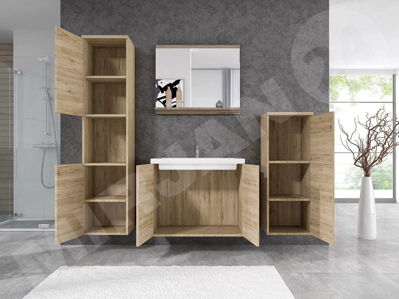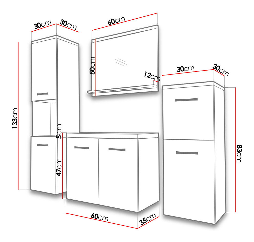 ZobrazitKoupelnová sestava je ideální volbou pro ty, kteří hledají pohodlí a styl. Koupelnový nábytek Megi I byl vytvořen s ohledem na funkčnost a dobrý vzhled. Sada obsahuje zrcadlo umístěné na desce, skříňku pod umyvadlo, umyvadlo a dvou skříněk. Zrcadlo obsahuje poličku. Nábytek je k dispozici v široké škále barev a má elegantní rukojeti. Sada se skládá z prvků: Velká nástěnná skříňka 005: šířka: 30 cm, výška: 133 cm, hloubka: 30 cm, Zrcadlo s policí 030: šířka: 60 cm, výška: 50 cm, hloubka: 12 cm, Skříňka pod umyvadlo 010: šířka 35 cm, Nástěnná skříňka střední 015: šířka: 30 cm, výška: 83 cm, hloubka: 30 cm, Umyvadlo 060: šířka: 60 cm, výška: 5 cm, hloubka: 35 cm provedení: korpus a fronty: matná laminovaná deska, skříňky jsou závěs