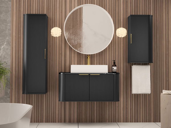 Koupelnový nábytek Mekona I potěší každého milovníka moderního designu. Dodají vaší koupelně lesk a eleganci. Dokonale zapadají do nejnovějších designových trendů. Vyznačují se mírně zaoblenými hranami. To, co upoutá pozornost, jsou krásné, frézované přední strany kombinované s prvky zlaté barvy. Závěsný koupelnový nábytek dodá místnosti prostornost, lehkost a opticky ji zvětší. Sestava obsahuje tři prostorné skříňky. Snadno umístíte ručníky, vlasové doplňky a kosmetiku při zachování úhledného prostoru.