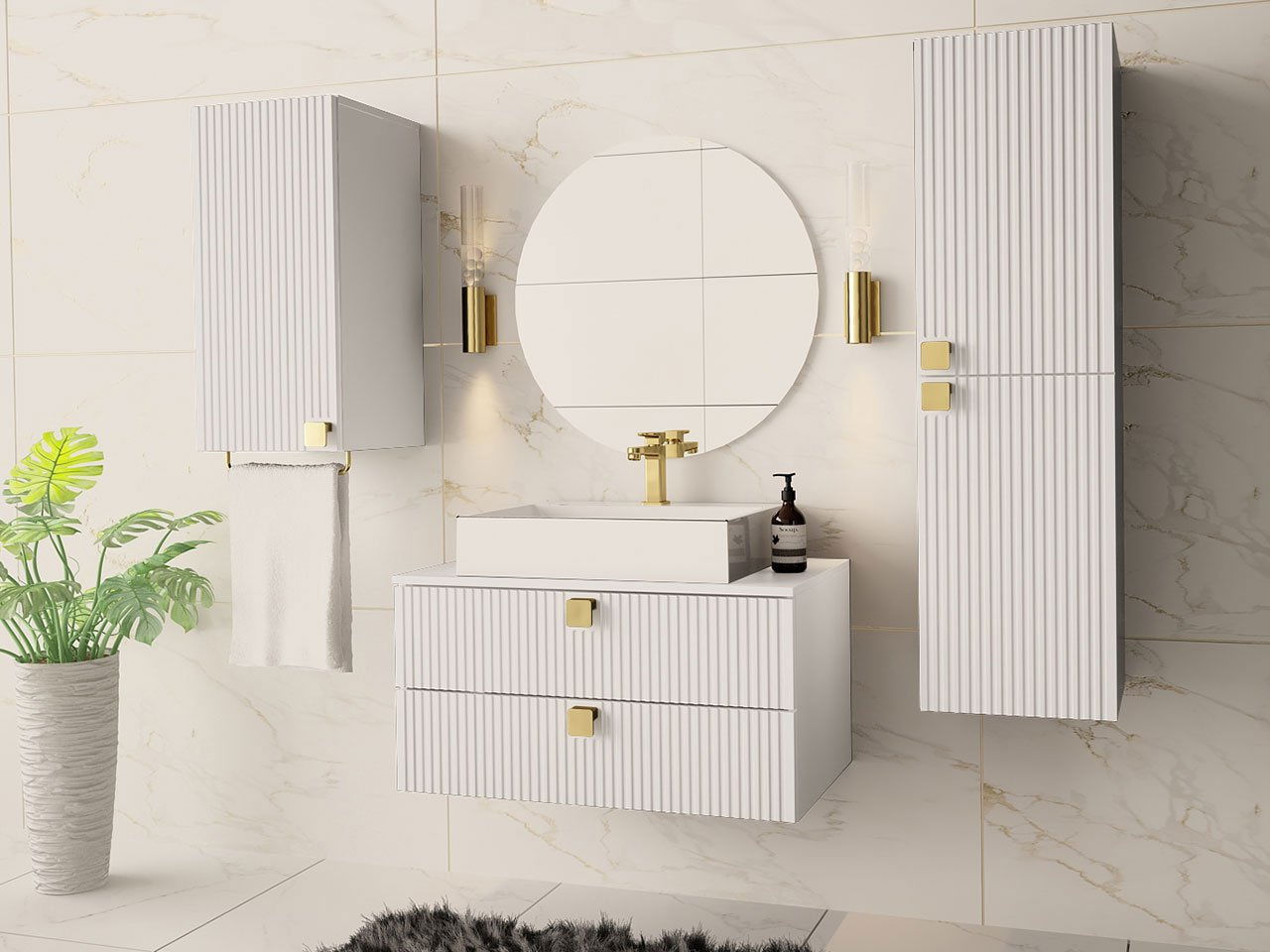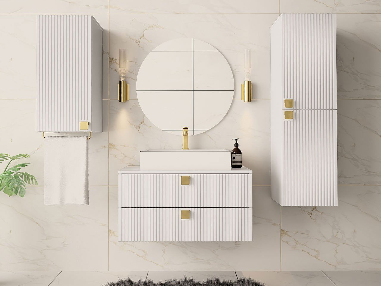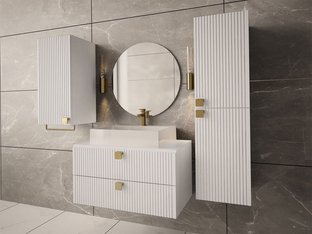 ZobrazitKoupelnová sestava je ideální volbou pro ty, kteří hledají pohodlí a styl. S koupelnovým nábytkem Petralio I si zařídíte krásnou a praktickou koupelnu v glamour stylu. Díky podélnému frézování na čelech získává nábytek originální vzhled. Zlaté prvky jsou doplňkem, který dodává nábytku eleganci a jedinečný styl. Moderní koupelnový nábytek není jen designové, ale také funkční řešení. Interiér prostorných skříněk vám dává možnost uložit potřebné doplňky, kosmetiku nebo domácí potřeby. Koupelnový nábytek je funkční, estetický a elegantní, díky čemuž je ideálním řešením do každé vkusně zařízené koupelny. Rozměry: Skříňka pod umyvadlo: šířka: 80 cm, výška: 42 cm, hloubka: 46 cm, Visací skříňka: šířka 35 cm, výška 120 cm, hloubka 35 cm, Visací skříňka: šířka 35 cm, výška 78 cm, hloubka 35 cm, Umýva cm, výška: 12 cm, hloubka: 42 cm Provedení: korpus: laminovaná deska o tloušťce 16 mm, fronty: 18 mm silná MDF deska, okraje zakončené PVC dýhou, rukojeť: plastový knoflík ve zlaté barvě, hydraulické panty za kuličkové zrcadlo není v ceně setu. Možnost nákupu z naší nabídky žádné nástěnné montážní prvky (lišty a hmoždinky) pro nástěnnou skříňku 02 a 03 - zákazník si je musí dokoupit samostatně Záruka: 24 měsíců