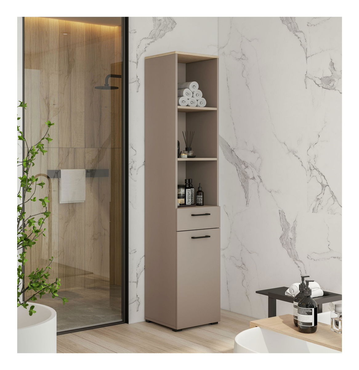 Vysoká koupelnová skříňka Arize (dub congo) je praktickým a stylovým řešením pro vaši koupelnu. S výškou 197 cm, šířkou 40,3 cm a hloubkou 39,8 cm nabízí dostatek úložného prostoru. Skříňka je vybavena jedněmi dvířky a jednou zásuvkou pro snadné uspořádání a organizaci vašich věcí. Kromě toho má také otevřené police, kde můžete mít své oblíbené věci na dohled. Provedení dub congo dodává skříňce eleganci a moderní vzhled do vašeho koupelnového interiéru. Skříňka Arize je ideálním doplňkem, který pomůže dotvořit design vaší koupelny a poskytne praktické úložné řešení.