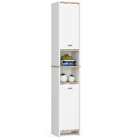 Koupelnová skříňka Bastian je vyrobena z kvalitní 16 mm oděruvzdorné dřevotřísky. Hrany jsou kryty SOF lemováním zajišťujícím vysokou ochranu proti poškození. Uvnitř skříňky se nacházejí 4 police. Skříňka je určena pro svépomocnou montáž.