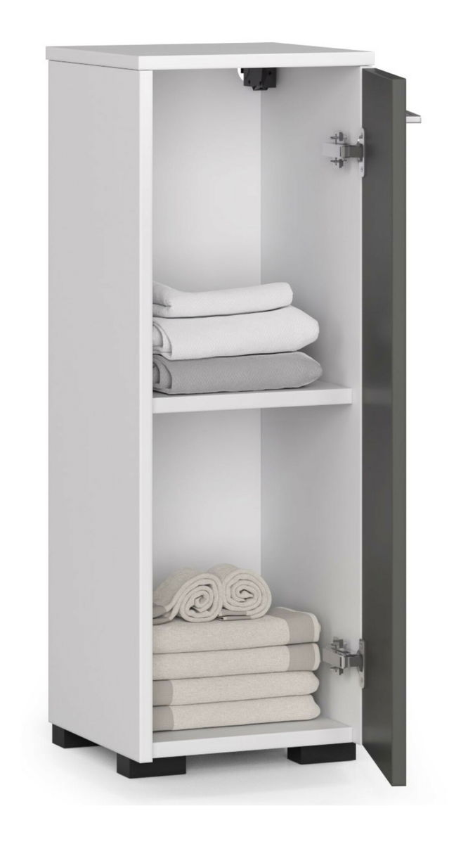 ZobrazitStojící koupelnová skříňka je ve své jednoduchosti velmi praktický a elegantní kus nábytku. Díky malým rozměrům najde uplatnění i v malých koupelnách. Do prostorných polic skříňky se vejdou ručníky, čistící prostředky nebo náhradní mýdla či kosmetika. Vrch skříňky, umístěný v pohodlné výšce, lze použít pro každodenní kosmetiku a parfémy. Skříňka je vyrobena z laminované desky, která je odolná vůči vlhkosti a oděru. Nábytek je dokončen odolnou a nebarvivou melaminovou dýhou. Skříňku můžete mýt tak často, jak chcete, bez obav z poškození jejího povrchu. Stojící koupelnová skříňka se hodí jak do koupelen se světlými a tmavými obklady, tak do klasických a retro koupelen s pozlaceným kováním. Nábytek v kombinaci s umyvadlovou skříňkou ze stejné kolekce bude vizuálně a funkčně atraktivním zařízením koupelny. Dostupná ve více barevných provedeních.