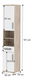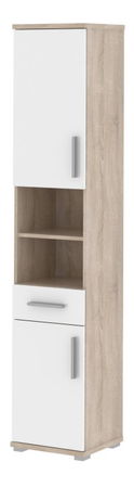 Vysoká koupelnová skříň s množstvím úložného prostoru je uzavřena dvířky. Ve střední části je rozdělena otevřeným úložným prostorem s poličkou.