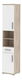 Vysoká koupelnová skříň s množstvím úložného prostoru je uzavřena dvířky. Ve střední části je rozdělena otevřeným úložným prostorem s poličkou.
