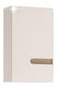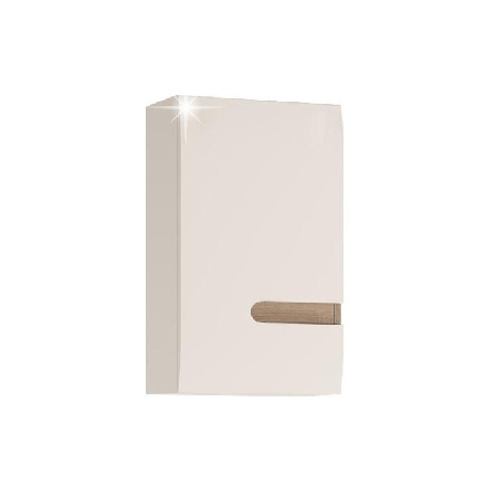 Jednodveřová horní skříňka vyrobena v levém provedení a z odolného materiálu laminované DTD, přední části jsou vyrobeny z MDF bílé barvy - extra vysoký lesk, s elegantními doplňky v hnědé barvě trufla - designovým pásem zasahujícím do 3/4 šířky skříňky přesahujícím do pravého boku skříňky. Korpus je bílé barvy, skříňka je odolná vůči poškrábání, vlhkosti, vysoké teplotě. Dvířka mají moderně zaoblené hrany.