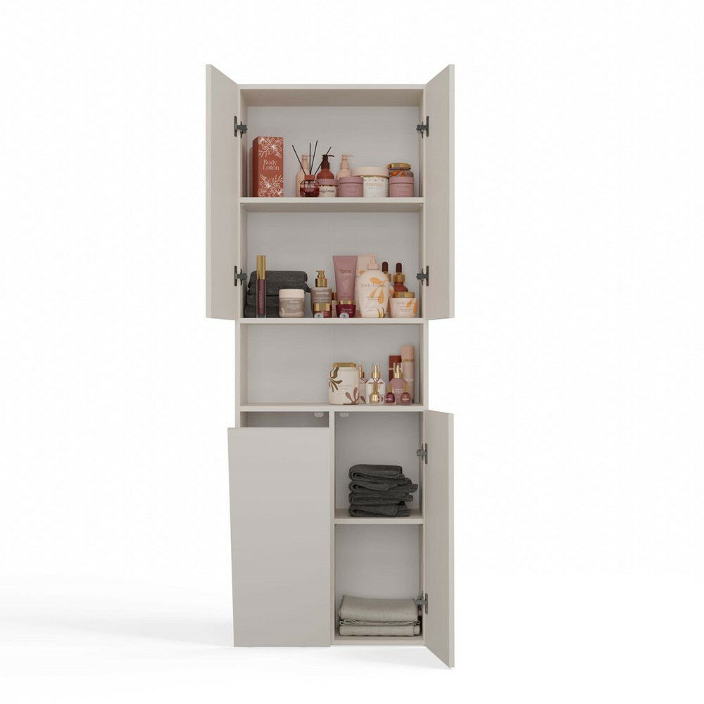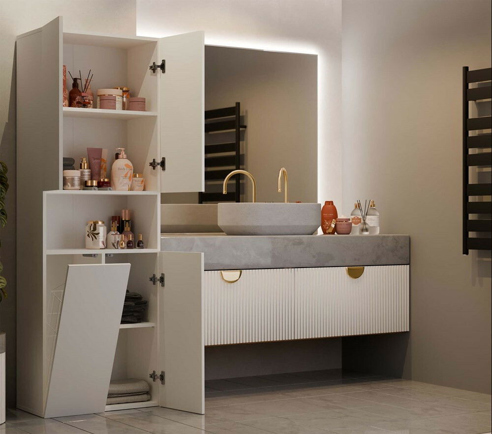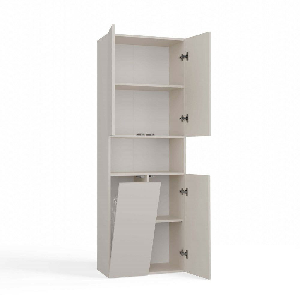 Koupelnová skříňka Neltossa 5 v elegantní kašmírové barvě je ideálním řešením pro efektivní využití prostoru ve vaší koupelně. S její smuklou konstrukcí a praktickým uspořádáním nabízí dostatek úložného prostoru, včetně čtyř uzamykatelných polic a otevřeného koše na prádlo. Inovativní systém otevírání TIP-ON bez úchytek zajišťuje pohodlný přístup k obsahu skříňky. Vysoká kvalita materiálů a precizní zpracování zaručují dlouhou životnost a estetický vzhled, který se hodí do různých interiérových stylů.